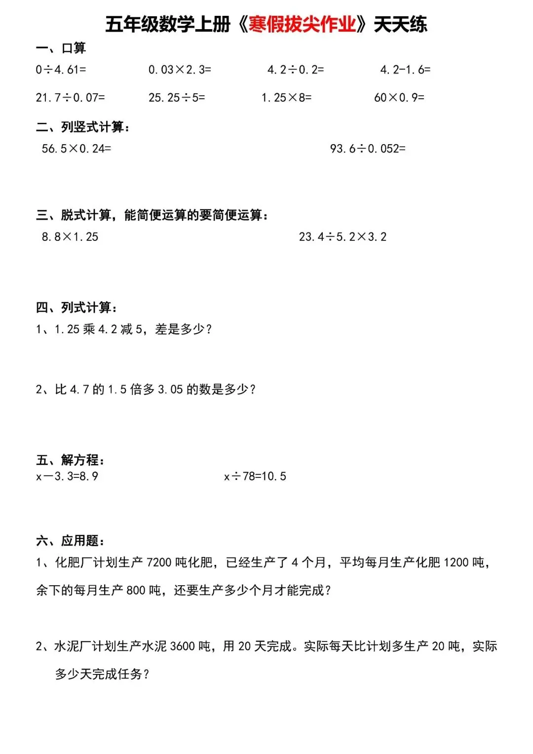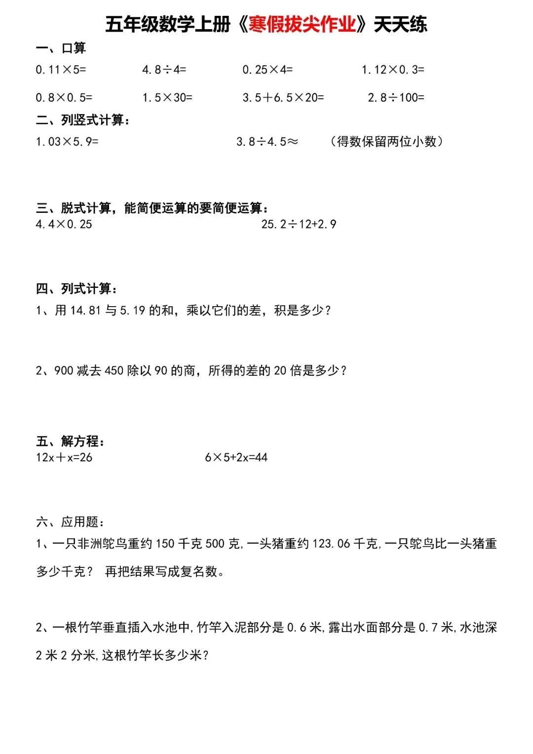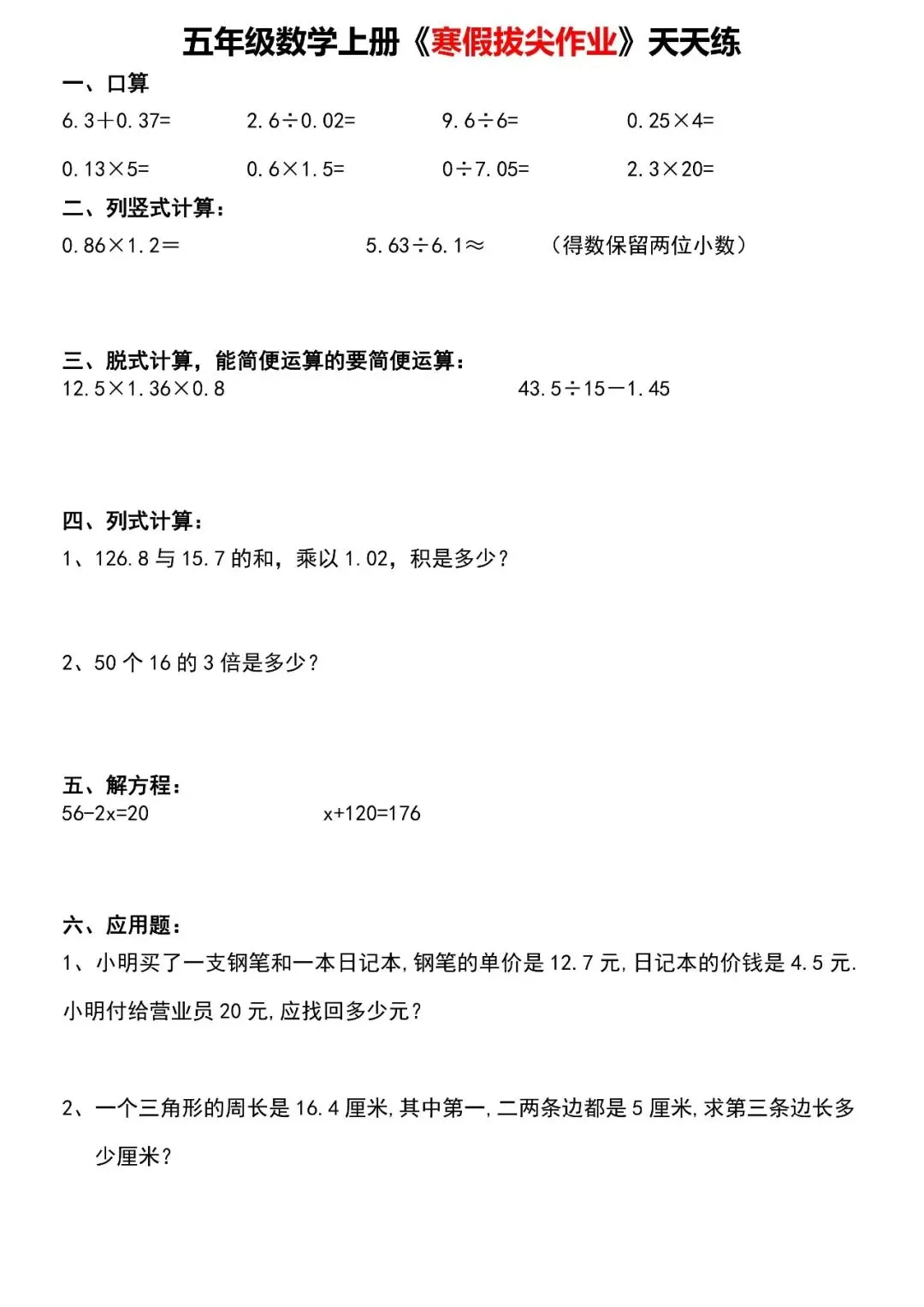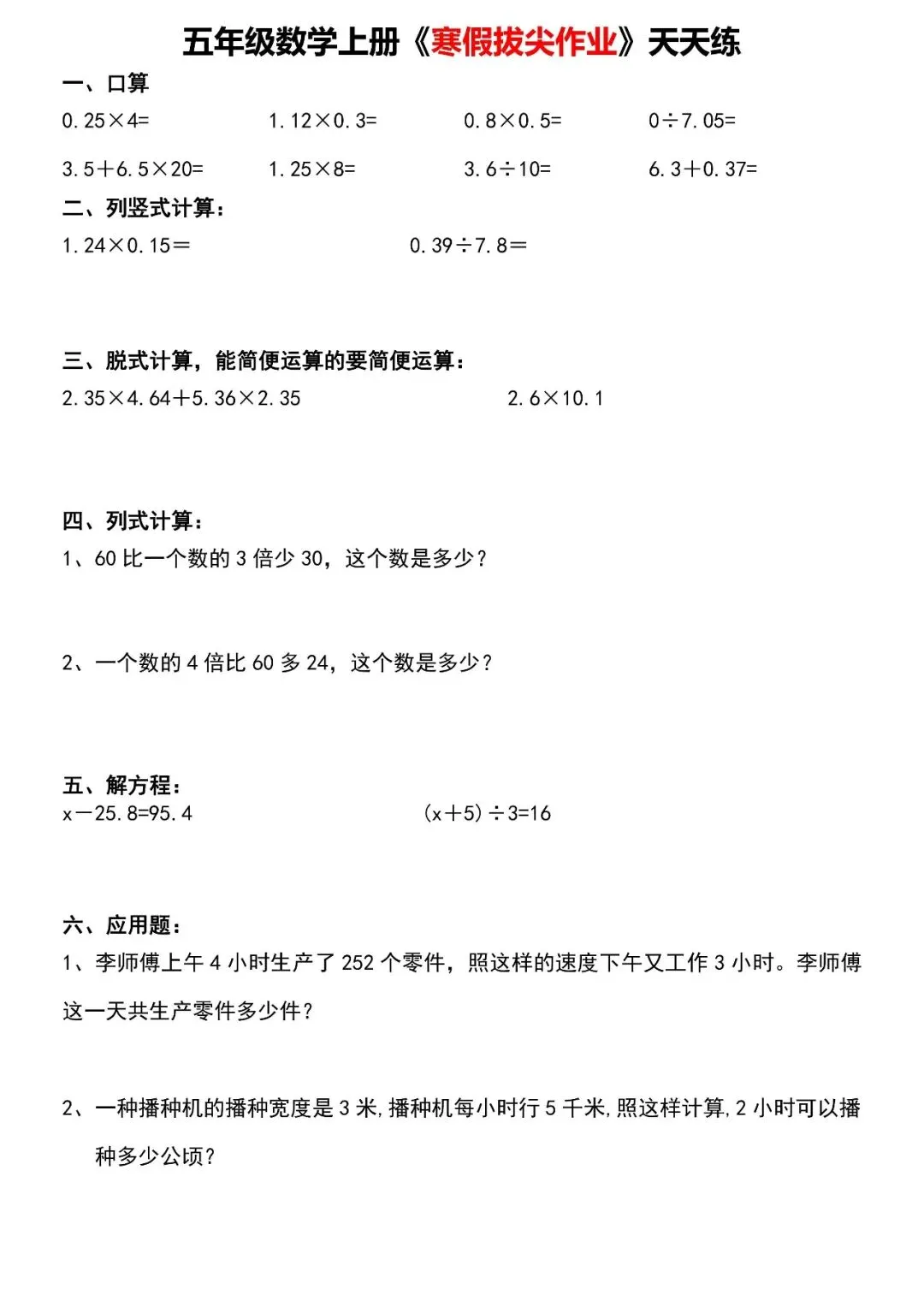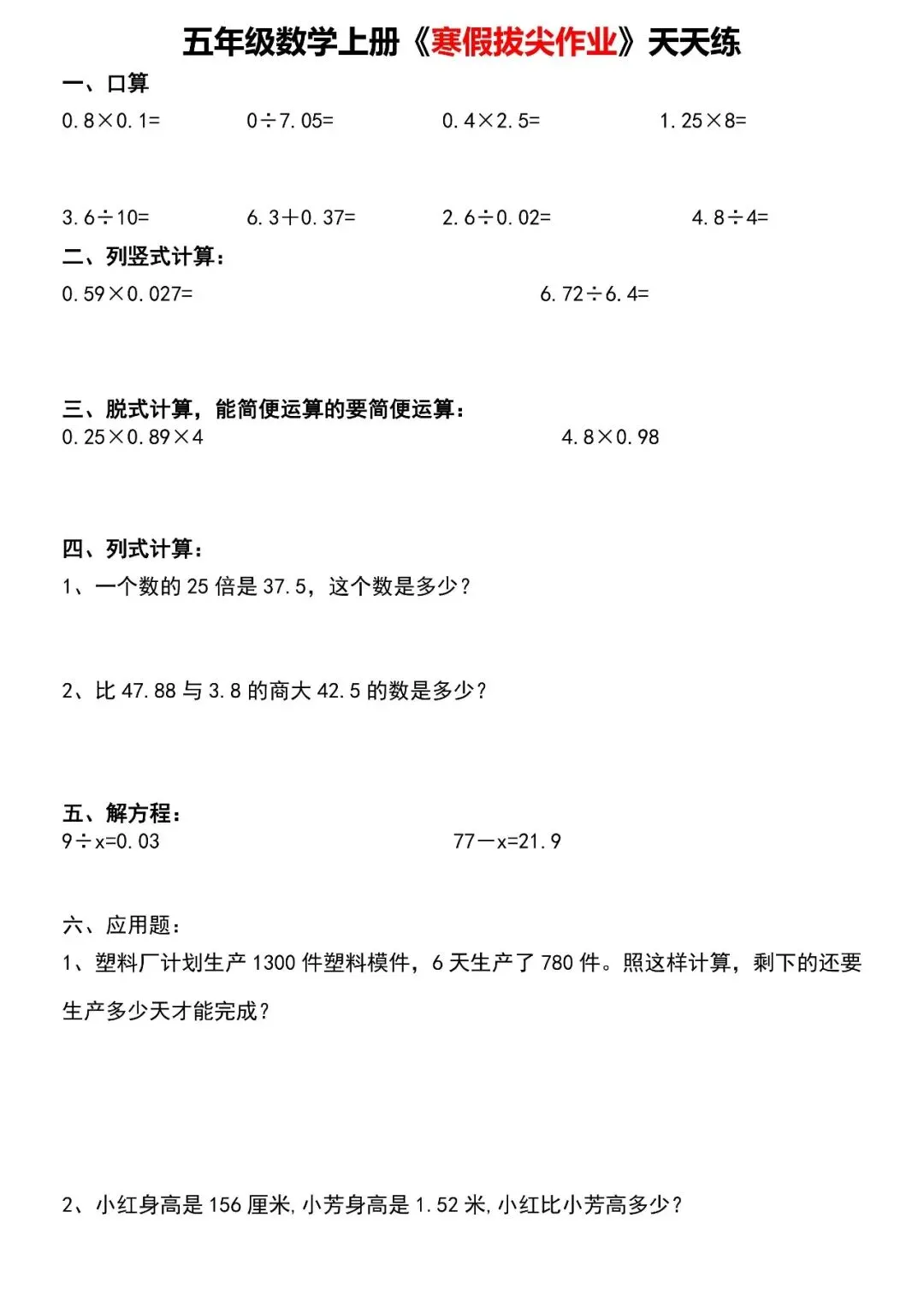 【寒假天天练】五年级数学,家长可免费下载打印出来,帮助孩子学习,完整版高清可打印,下载方式见文末。