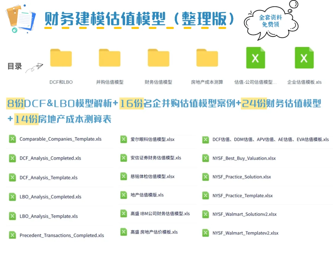 今天,我们为大家整理了一套 「财务建模估值模型工具包」,这套资料涵盖了从入门到进阶的核心模型框架,已经过系统梳理和实用化优化,不止是单个Excel表格,更是一套从数据输入到报告输出的完整解决方案。