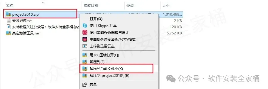 1.打开下载的project2010安装包,鼠标右击软件压缩包,选择【解压到当前文件夹】。