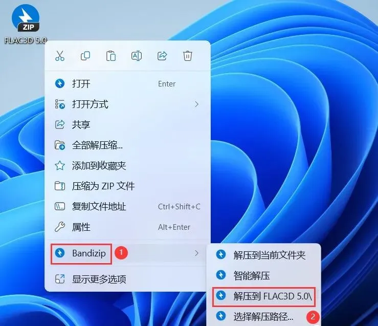1、下载FLAC3D 5.0软件安装包到电脑上,右键选择【解压到FLAC3D 5.0\】