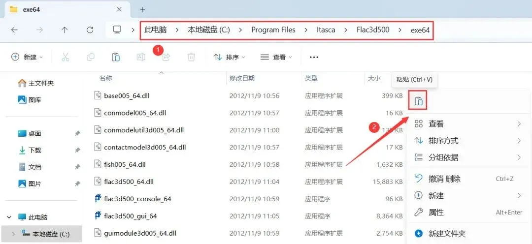 11、打开路径:C:\Program Files\ltasca\Flac3d500\exe64,再右键文件夹的空白处,点击【粘贴按钮】