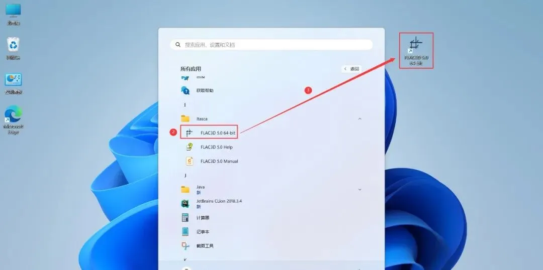 14、回到桌面,点击任务栏的【开始菜单】,在【所有应用】中找到【FLAC3D 5.0软件图标】,将软件图标拖到桌面上,完成软件桌面快捷方式的创建