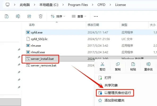 16.以管理员身份运行(右键点击)C:\Program Files\CPFD\License\server_install.bat,并等待新的服务“CPFD RLM Server”被安装并启动。