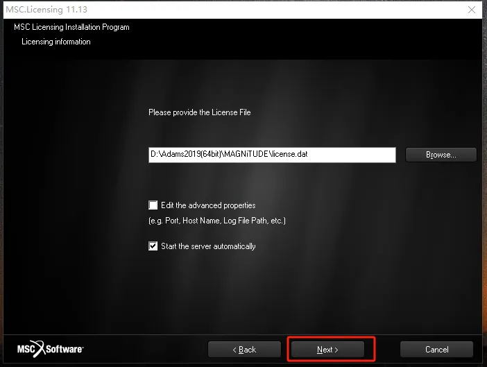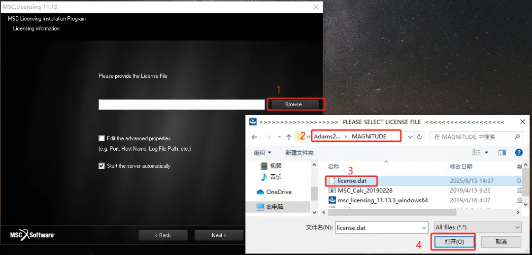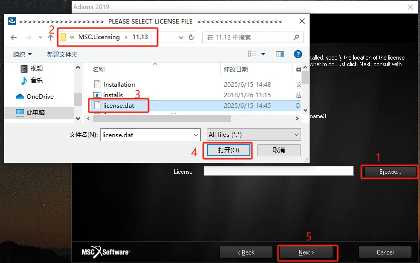 第二十五步:点击【Browse】选择该路径下【C:\MSC.Software\MSC.Licensing\11.13】中的【license.dat】文件,点击【打开】,然后点【Next】。