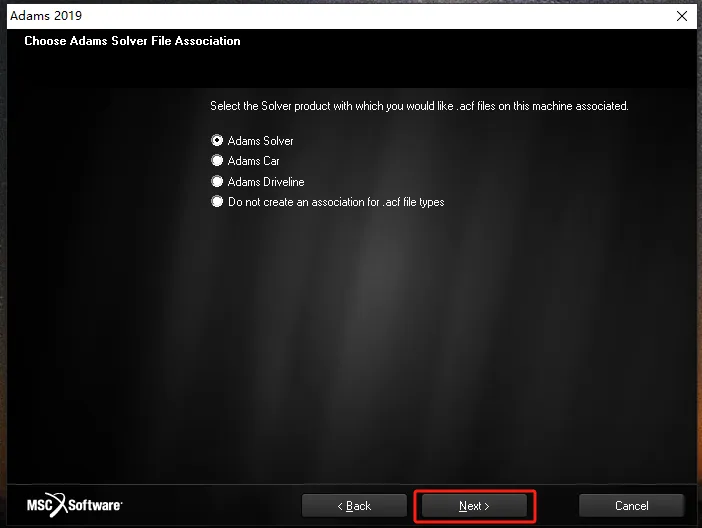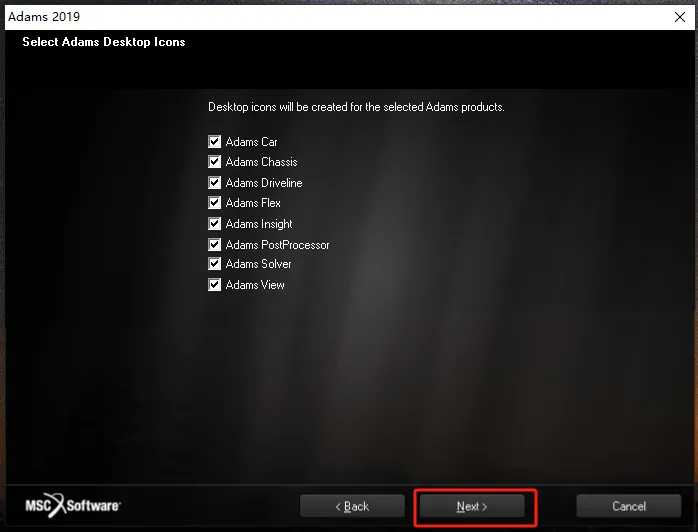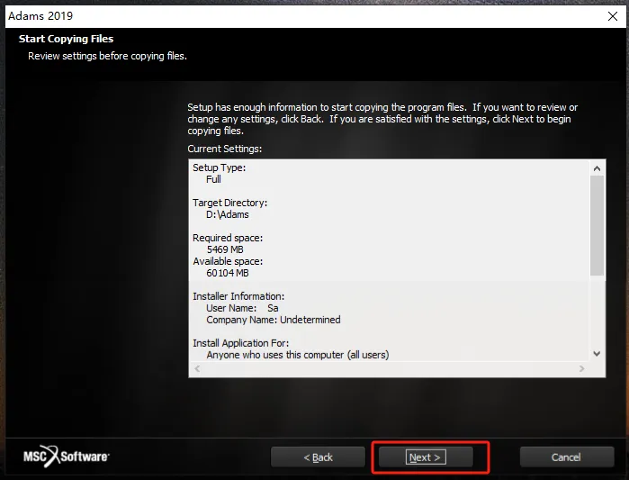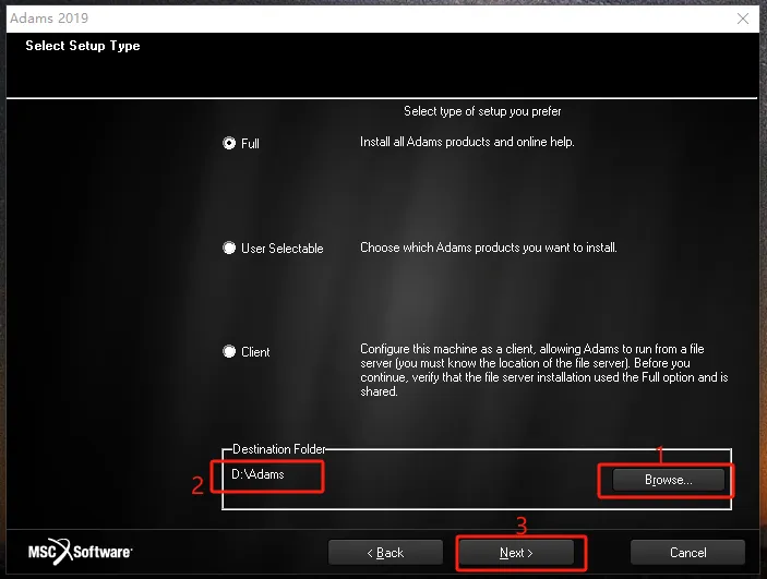 第二十二步:通过【Browse】,将文件安装在【D:\Adams】目录下,然后点【Next】。(此步安装路径一定要改,不可只改盘符,否则可能导致软件不可使用,安装路径中也不要有中文。)