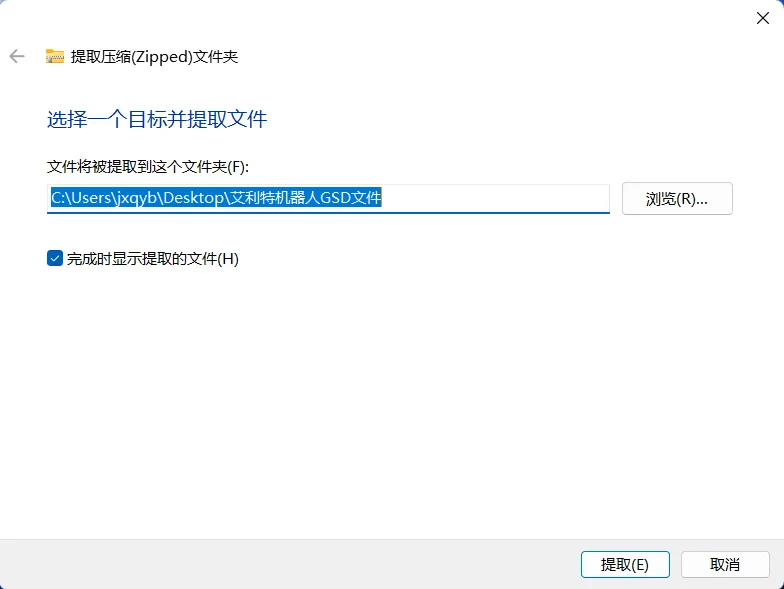 2.1,鼠标右击【艾利特机器人GSD文件】压缩包(Win11系统需先点击“显示更多选项”)选择【全部解压缩】。如下图: