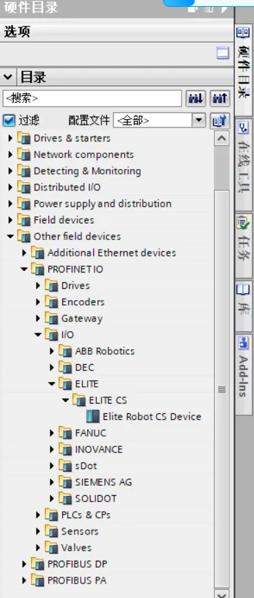 2.9,然后在硬件目录中点击【Other field devices】->【PROFINET IO】->【I/O】->【ELITE】->【ELITE CS】中找到艾利特机器人Elite Robot CS Device 设备。