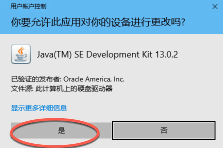 1、双击文件:jdk-13.0.2_windows-x64_bin.exe,选择是
