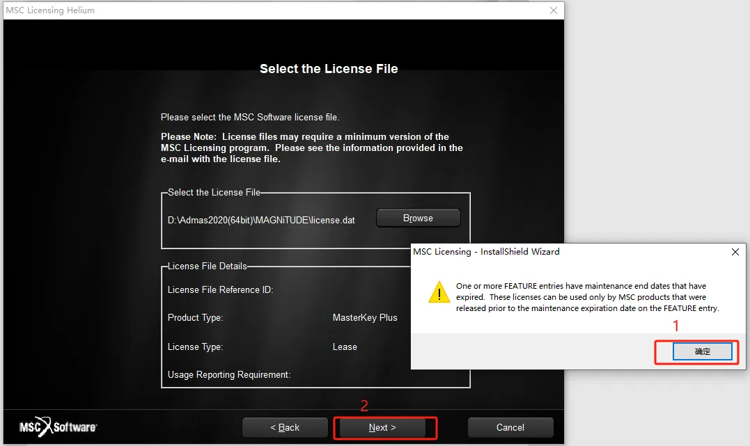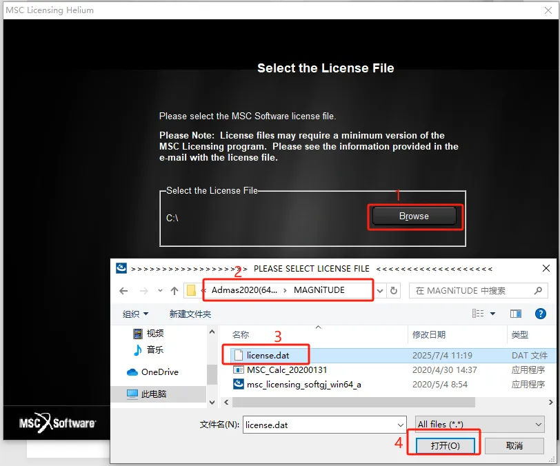 第十二步:点击【Browse】选择安装包解压后的【Adams202064bit)】文件夹中【MAGNiTUDE】文件夹下的【license.dat】(即步骤7生成的文件),点击【打开】。