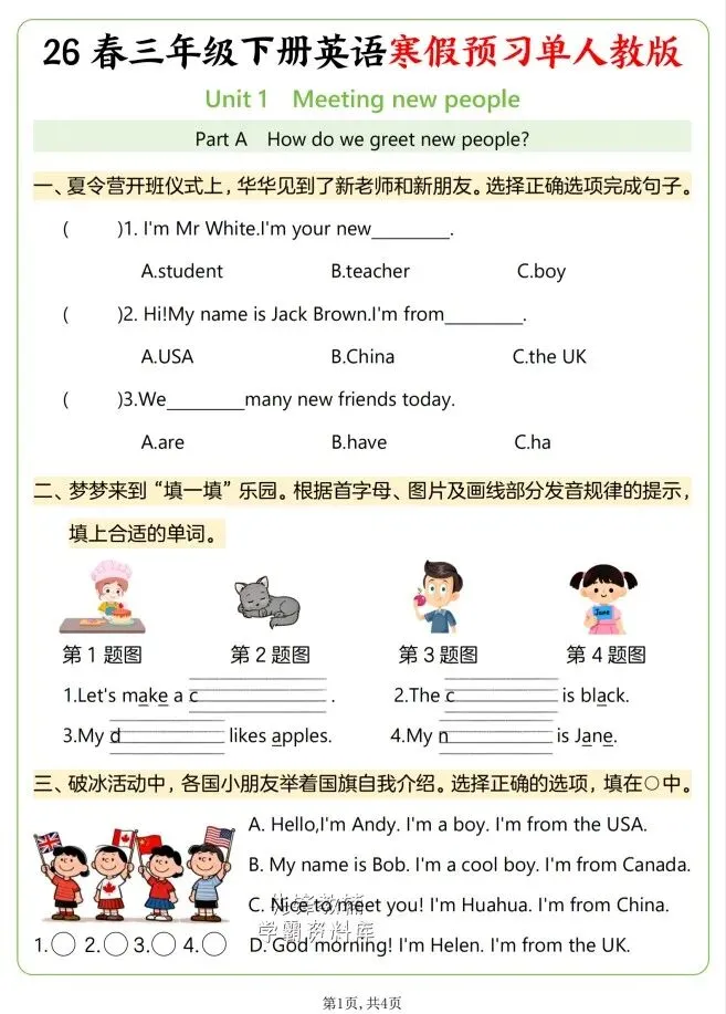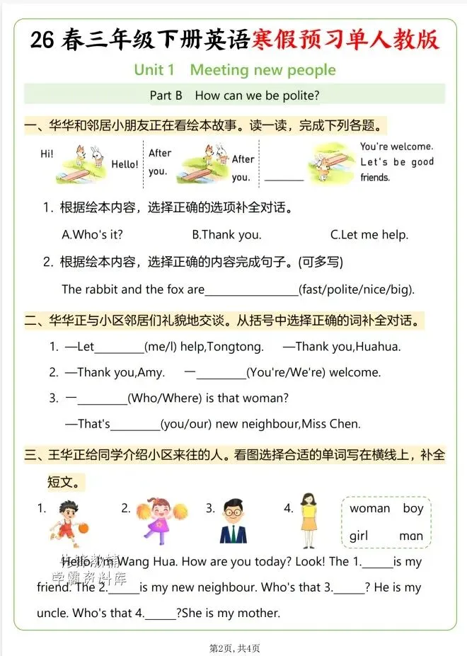 今天给大家整理了26年春三年级下册英语人教版寒假第一单元同步预习单,转发给朋友或班级群,受益更多人,帮助孩子学习!