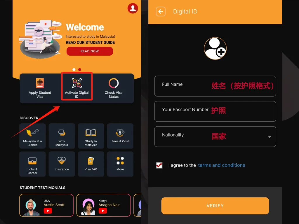 步骤⑤:点击Activate Digital ID激活,注册数字ID,分别输入全名、护照号码、国籍,勾选同意条款,最后点击“Verify”。