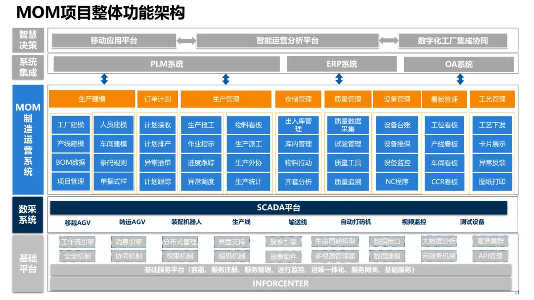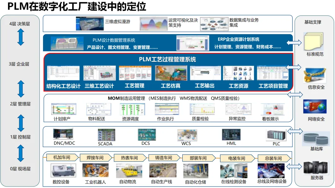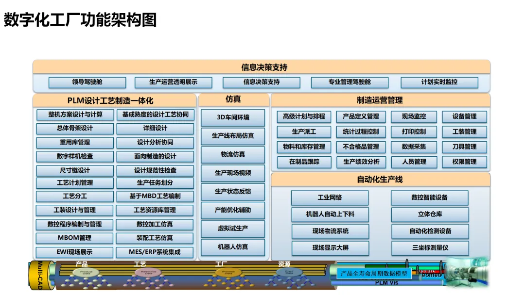 这份数字化工厂解决方案围绕 PLM 和 MOM 两大核心构建,搭建了从决策层到现场层的多层级架构,以标准规范、信息安全等为基础支撑,整合了 ERP、MES、WMS 等多系统及数控设备、工业机器人等智能装备,覆盖设计工艺管理、生产计划排程、仓储物流协同、质量全程追溯、设备运维监控等全流程环节。方案融入三维仿真、数据集成、可视化监控等技术,实现设计、工艺、制造的一体化协同,通过全三维数据应用、闭环变更管理、条码化追溯、多层级可视化看板等功能,助力企业缩短研发周期、提升生产效率与产品质量,赋能智能化决策与高效运营。