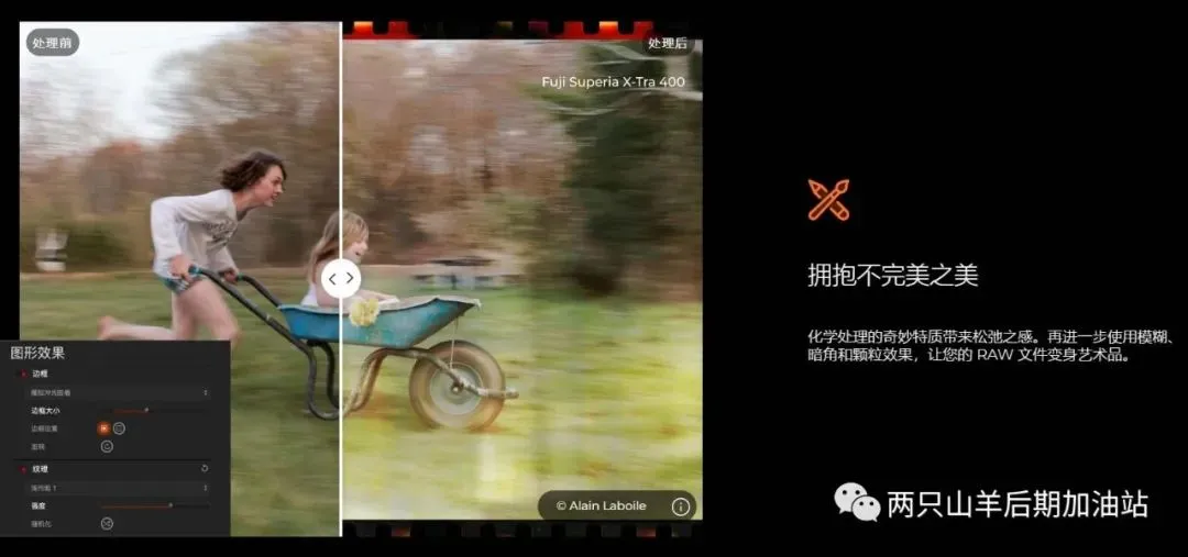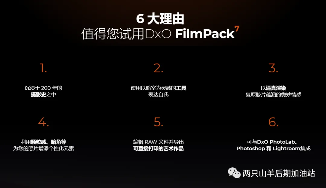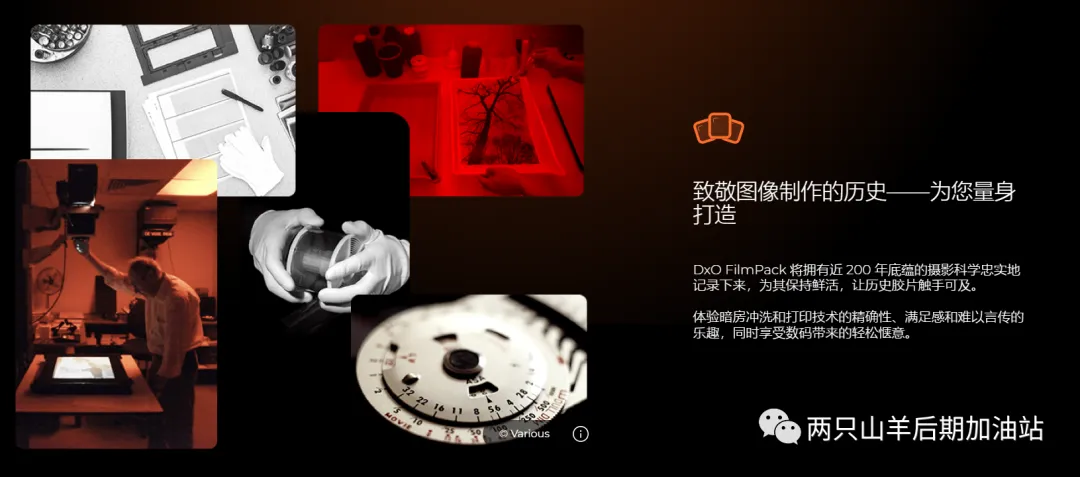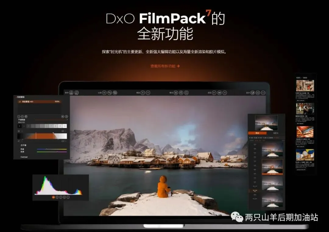 从历史上的摄影大师和他们最喜欢的胶片款式中获取灵感“时光机”已升级,配备可生成 26 款全新预设的 22 张全新图像。着眼历史,将胶片的魔力带到当下。DxO FilmPack 7 基于详尽研究,涵盖海量精准还原的胶片效果:包括 40 种黑白胶片和 49 种彩色负片和正片。除惊艳的胶片效果外,还有 39 款标志性数字模拟、 39 款设计师预设(包括电影样式)、34 款边框、27 款纹理和 46 款漏光预设。了解知名摄影师如何使用他们喜爱的胶片拍下历史上的重要时刻。使用便捷彩色滤镜、完全可控的创意暗角和两款模糊效果(柔焦和暗角),呈现怀旧镜头效果。为图像添加富有情绪的纹理和漏光效果,控制其强度,并随意调整位置和方向,打造独一无二的外观。使用便捷彩色滤镜、完全可控的创意暗角和两款模糊效果(柔焦和暗角),呈现怀旧镜头效果。丰富预设选择触手可及
