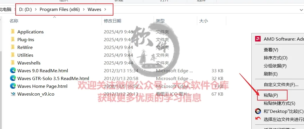 16.在D盘的Program Files (x86)/ Waves文件夹下点击粘贴;