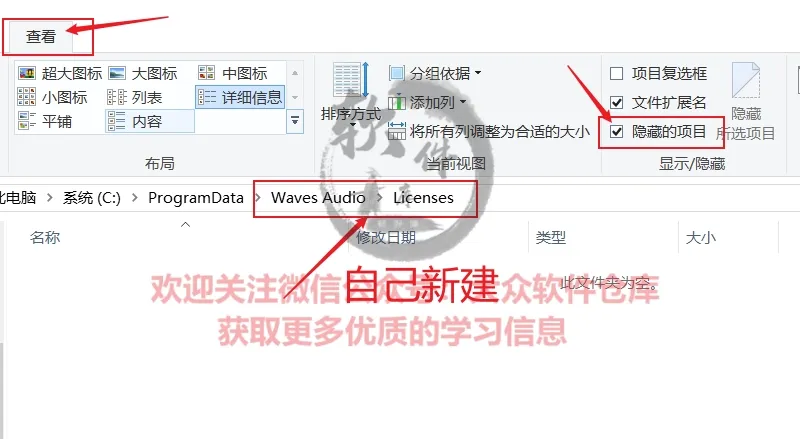 21.自己在C盘的ProgramData文件夹下新建Waves Audio-Licenses文件夹;(ProgramData需要勾选隐藏的项目才能看到)