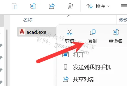 12,找到并选中“acad.exe”文件,点击鼠标右键,点击“复制”,或者使用快捷键“Ctrl”+“C”复制