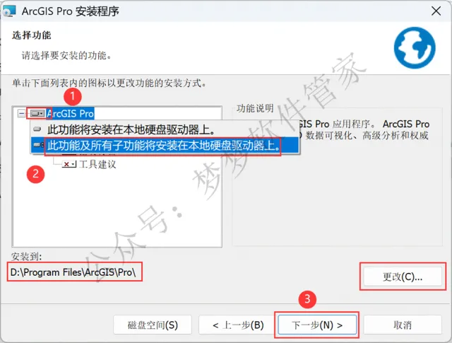 12、右键所有带【红色X】的模块,再点击【此功能及所有子功能将安装在本地硬盘驱动器上】,软件默认安装在C盘,可自定义更改软件安装位置,这里小编选择安装在D盘;点击【下一步】