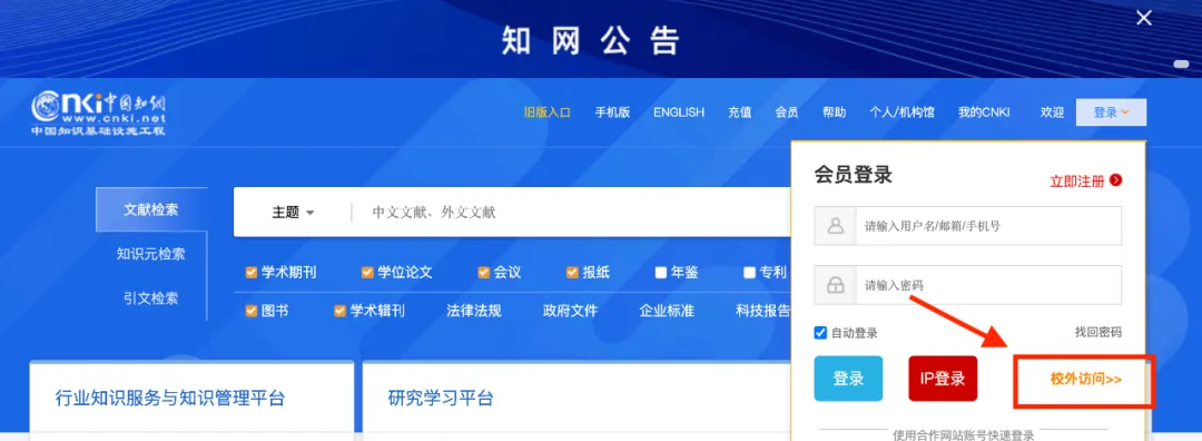 登录知网选择校外访问,输入校园网账号信息,通过身份验证即可下载学校购买的论文资料。