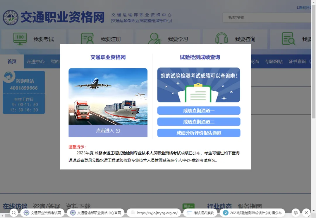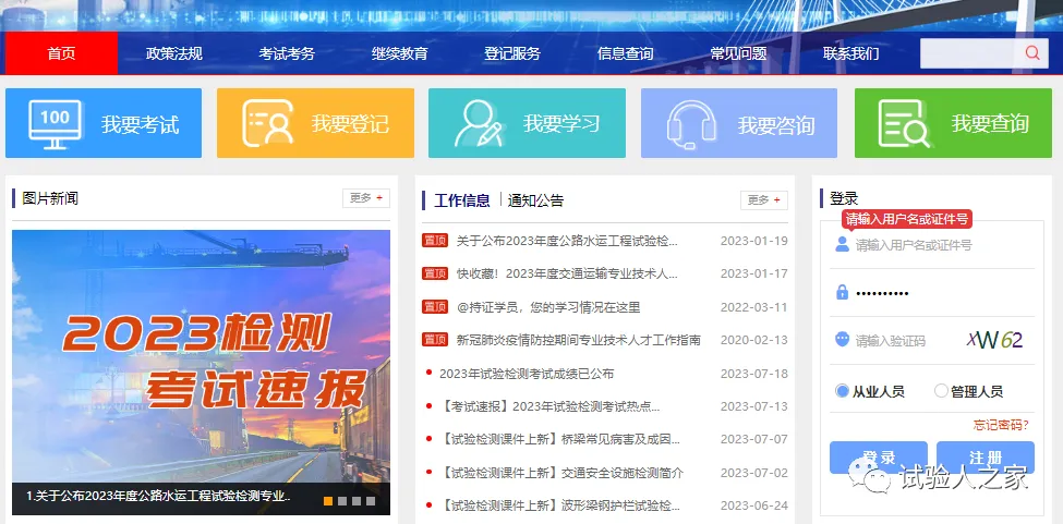 2023年 公路水运试验检测考试成绩已公布,考生可通过交通职业资格网或者公路水运工程试验检测专业技术人员管理系统查询,方法如下:1.交通职业资格网:https://www.jtzyzg.org.cn