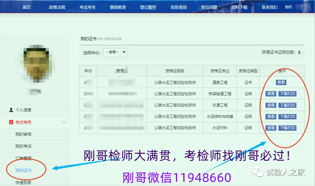 二、增项的证书:在公路水运工程试验检测专业技术人员管理系统查询下载,打开下面网址→登录→考试考务→我的证书→查看或打印网址:https://syjc.jtzyzg.org.cn