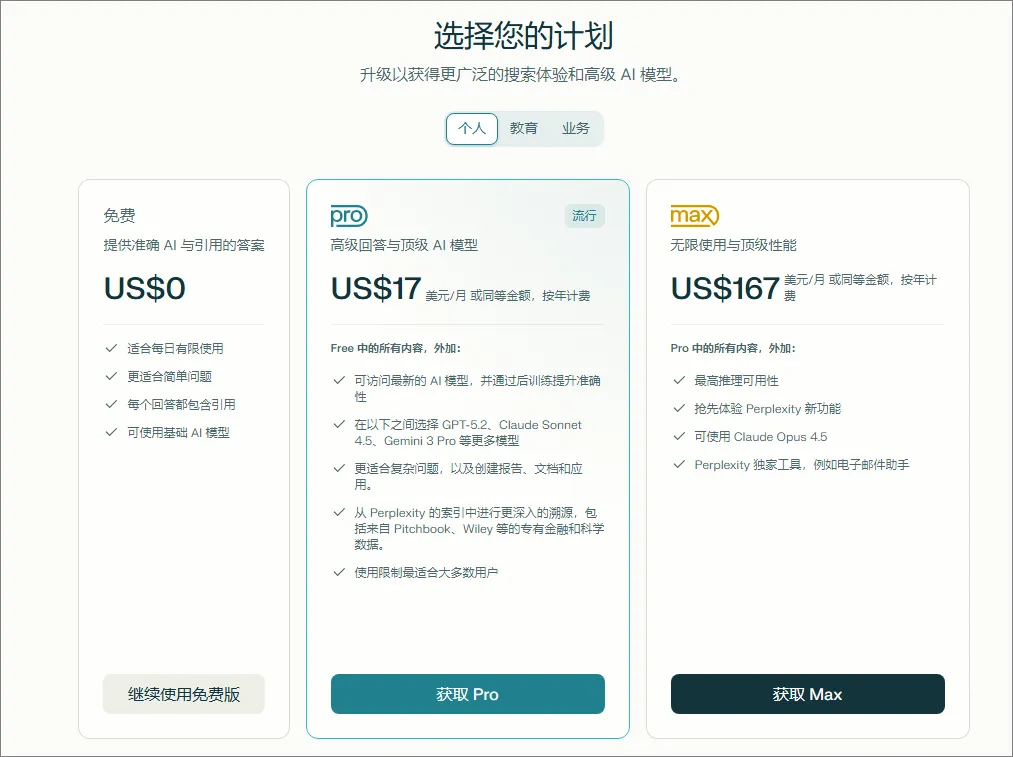 订阅 Pro、Max 或 Enterprise 后,可以解锁更强模型算力和高级功能,比如邮件助理、后台任务处理、多模型切换等,整体可玩性更高。