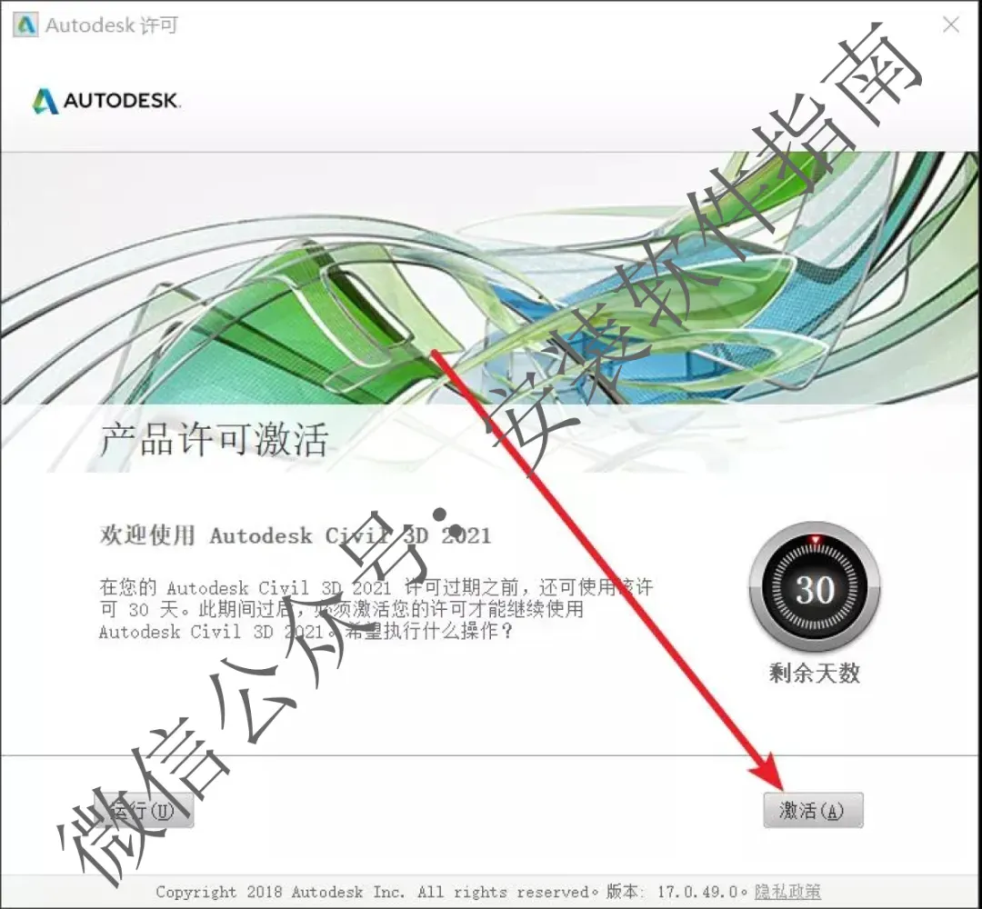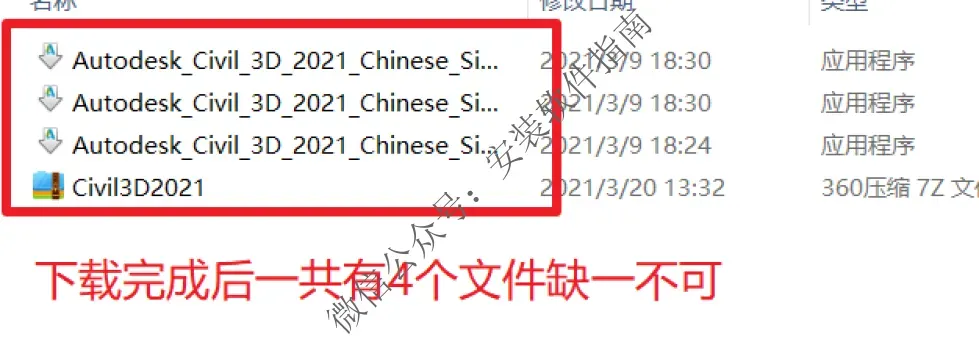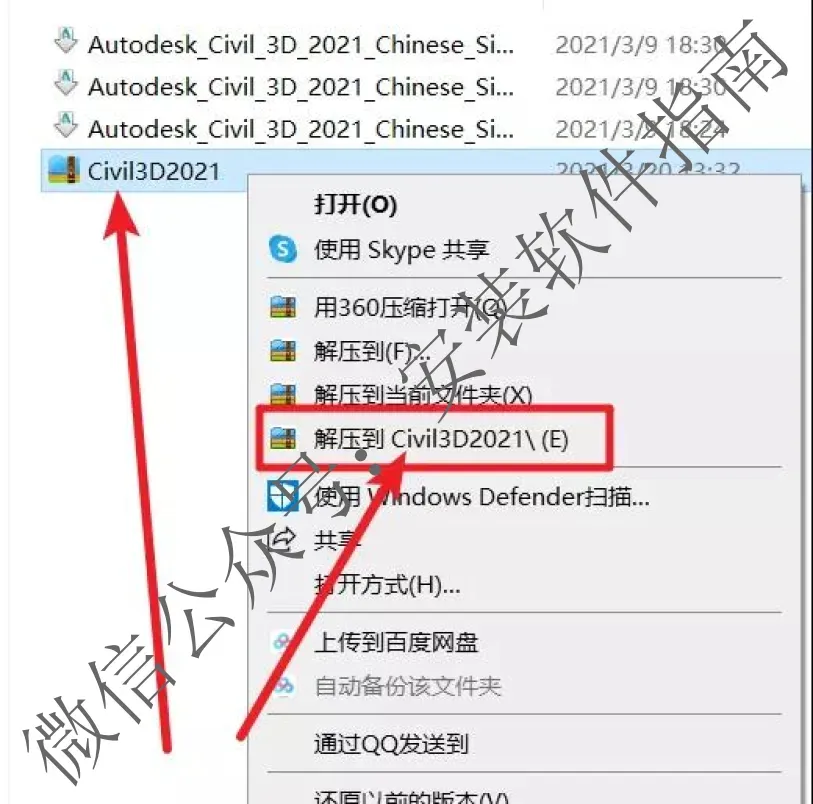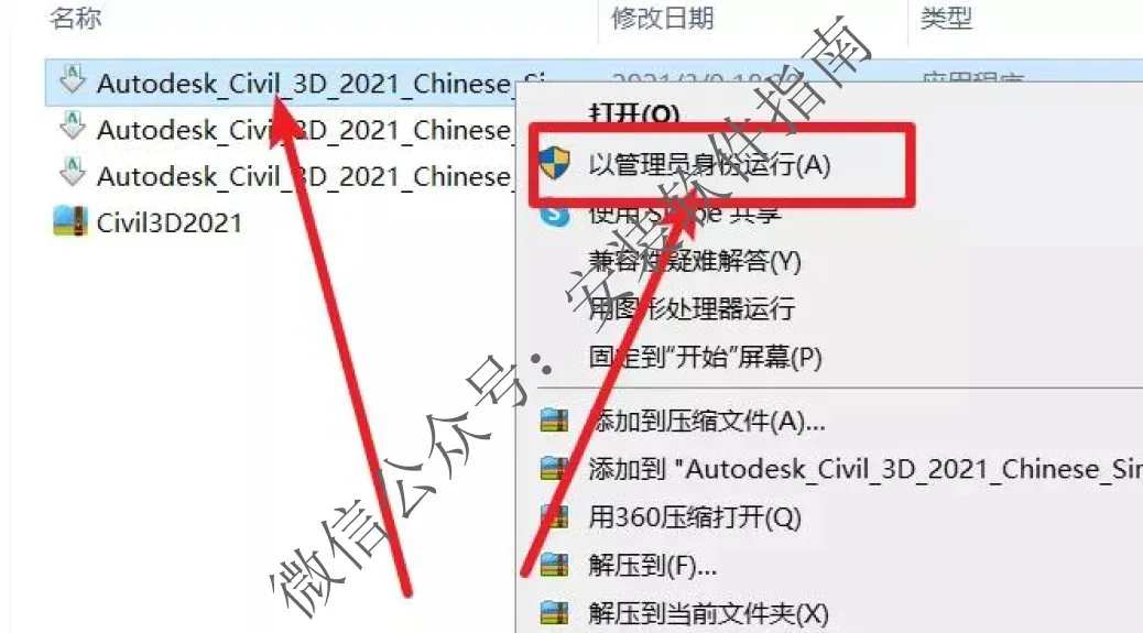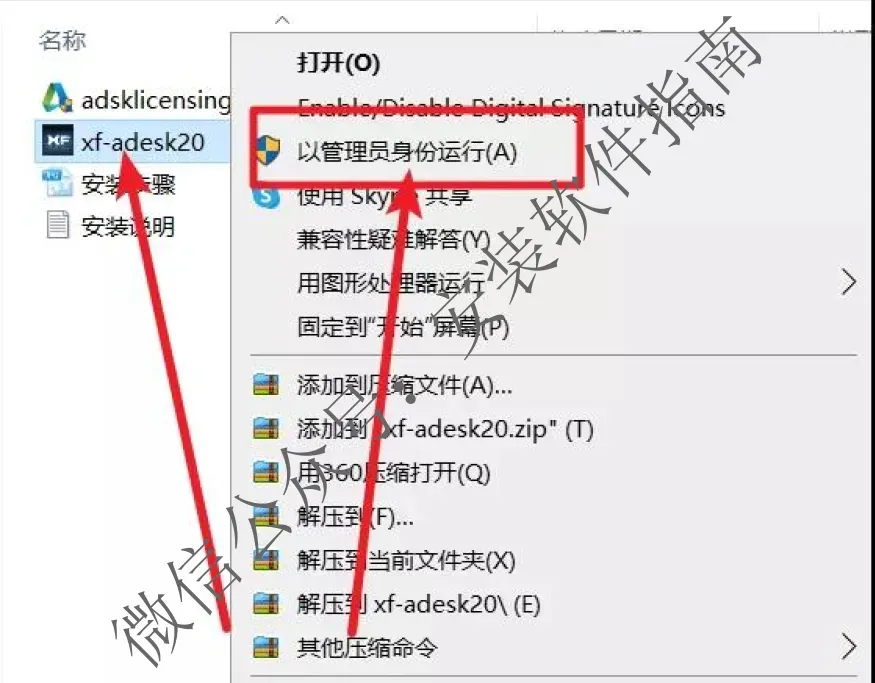 23.回到【Civil3D2021】文件夹对着【xf-adesk20】右击以管理员身份运行(如果文件夹里没有“xf-adesk”或“打不开此程序”,请关闭电脑上的“杀毒软件、防火墙”后重新解压Civil3D2021安装包,Win10系统还需关闭“Windows Defender”。)
