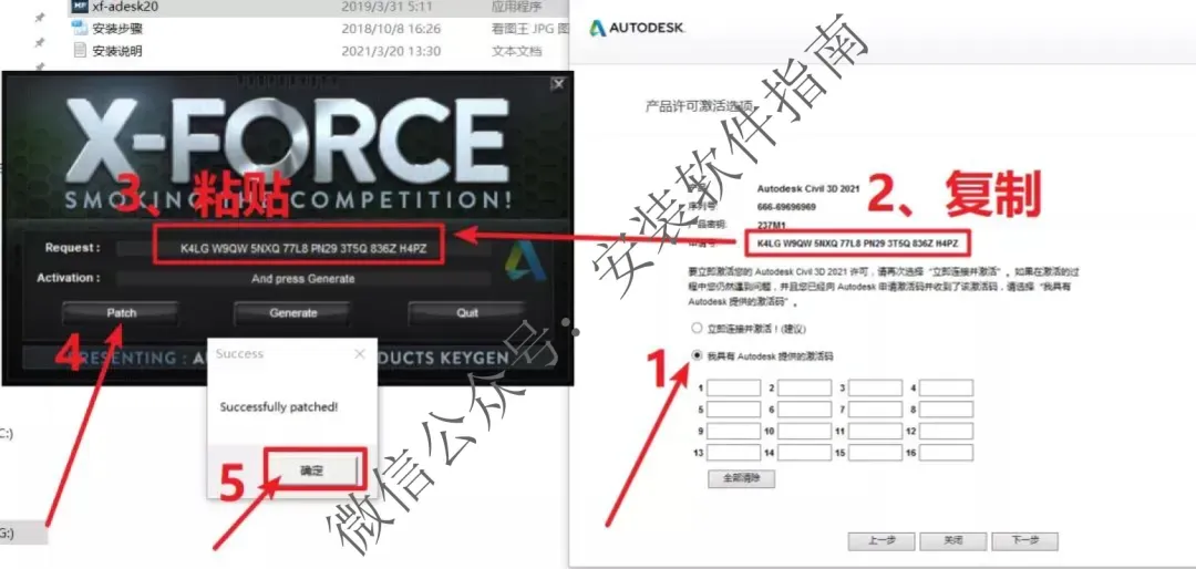 24.点我具有Autodesk提供的激活码;复制【申请号】后的代码;然后将代码粘贴到【Request】后的框中;点【Patch】然后点【确定】