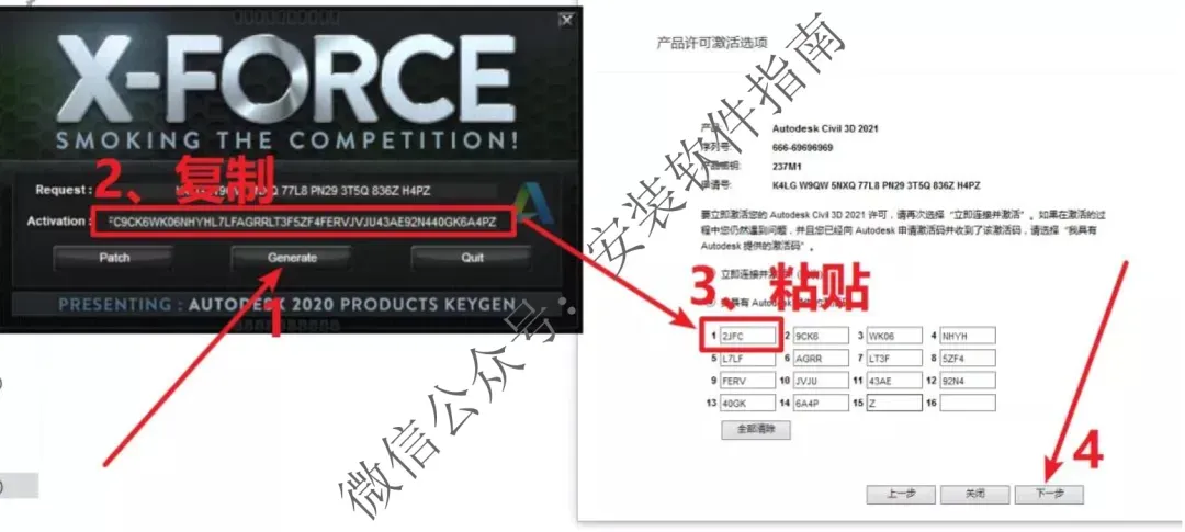25.点【Generate】生成激活码;复制【Activation】后面框中的激活码;将激活码粘贴到图上3下方的红框中,然后点下一步