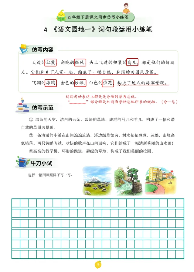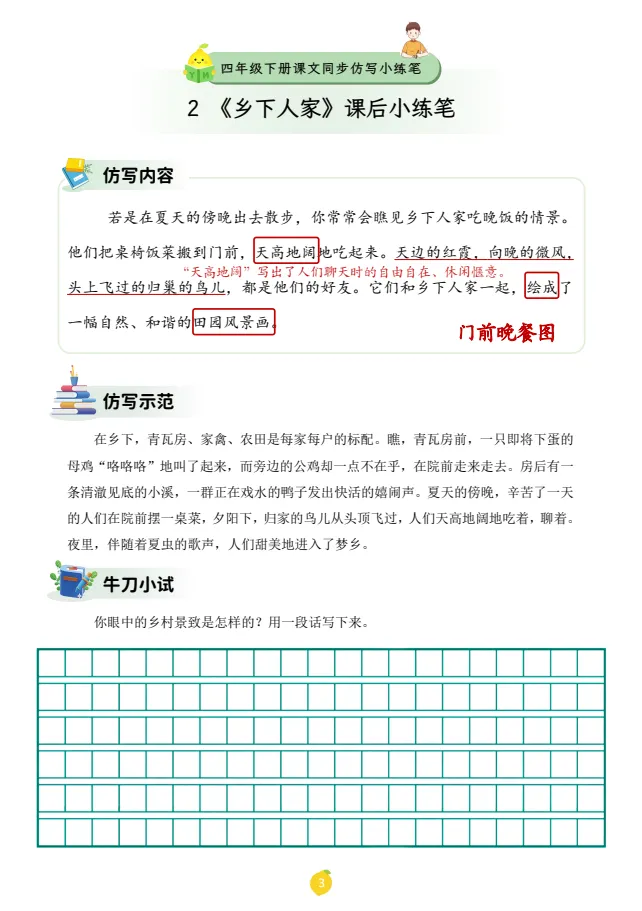 今天,给大家分享:26春四年级下册课文仿写小练笔!电子版!可下载打印!如果觉得这份资料不错,建议分享到班级群/年级群,让其他家长打印出来,帮助孩子学习