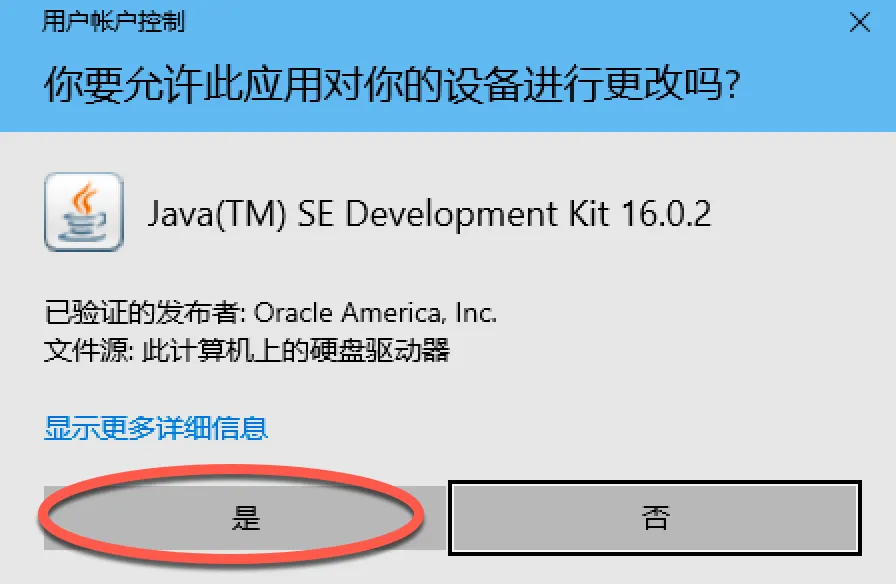 1、双击文件:jdk-16.0.2_windows-x64_bin.exe,选择是