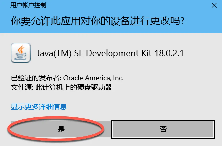 1、双击文件:jdk-18.0.2.1_windows-x64_bin.exe,选择是