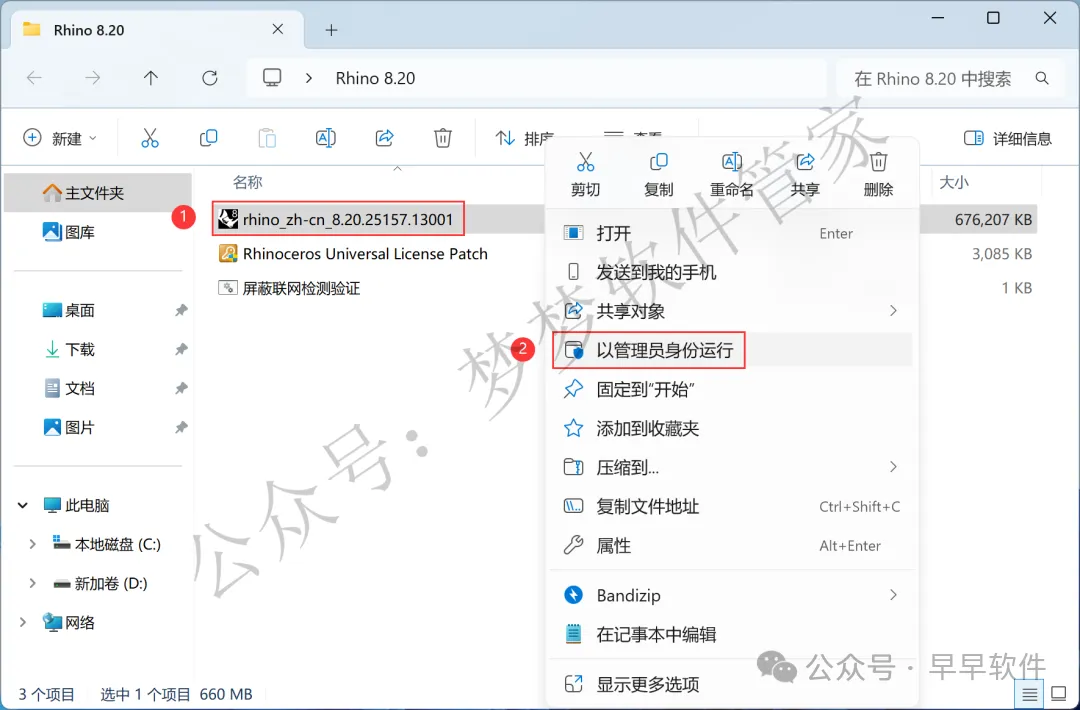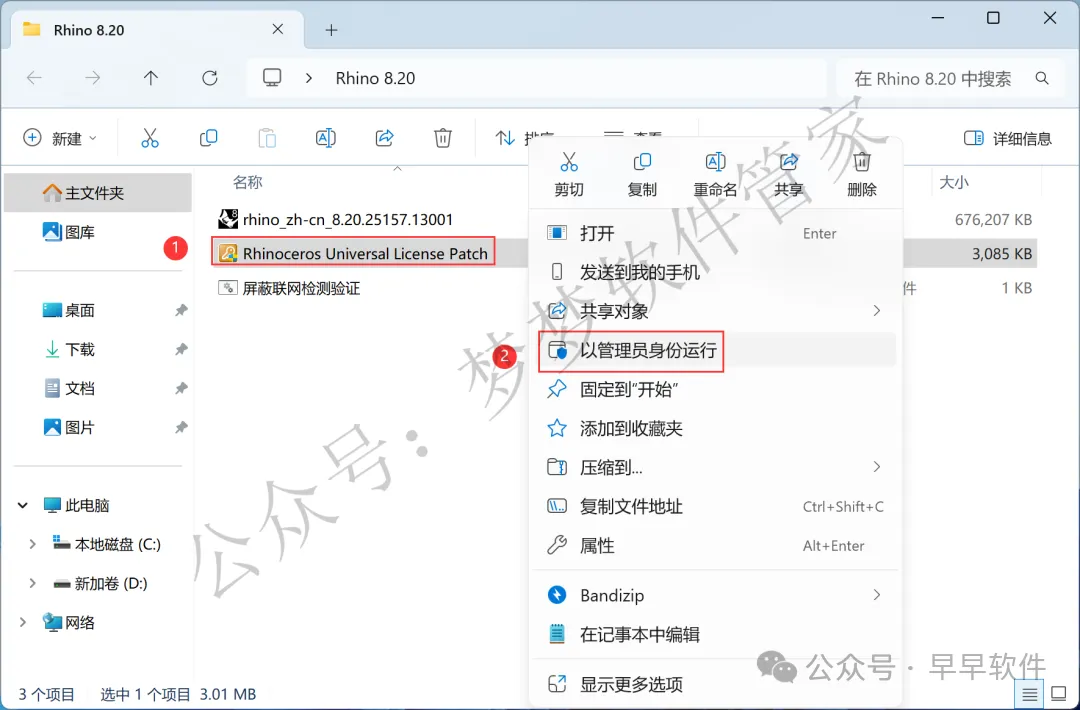 10、回到Rhino 8.20文件夹,找到【Rhinoceros…Patch】程序,右键选择【以管理员身份运行】它