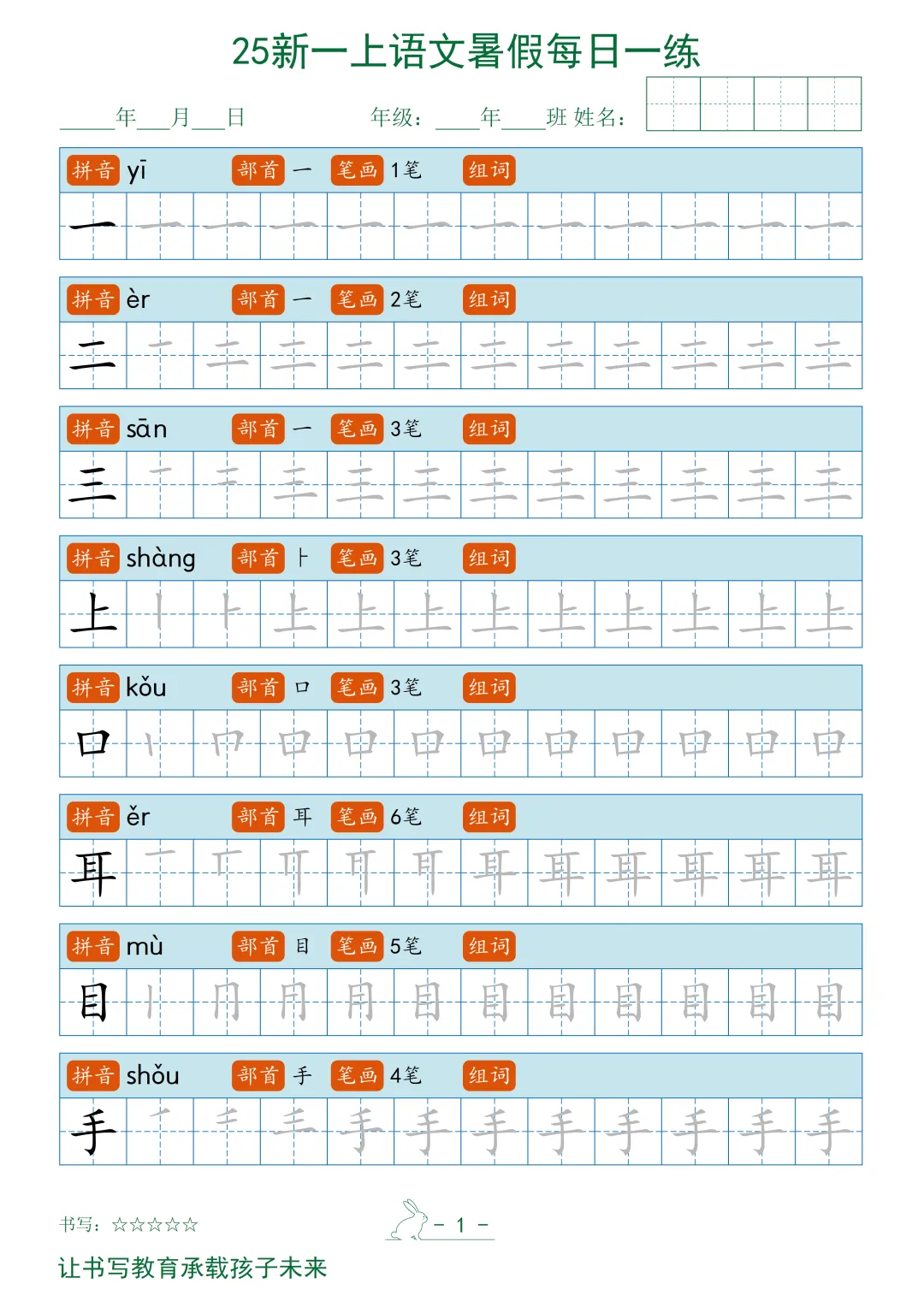 2025秋新一上语文暑假每日一练字帖