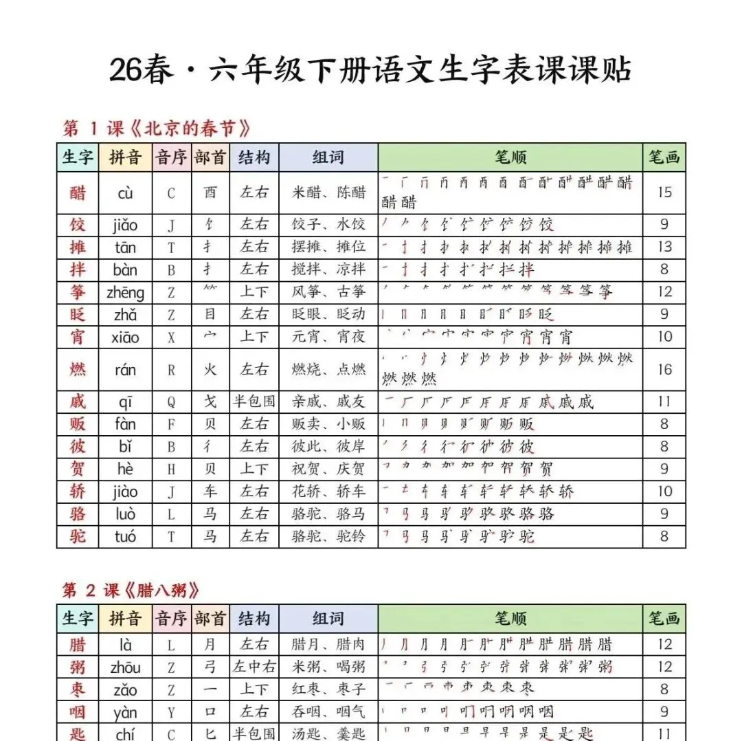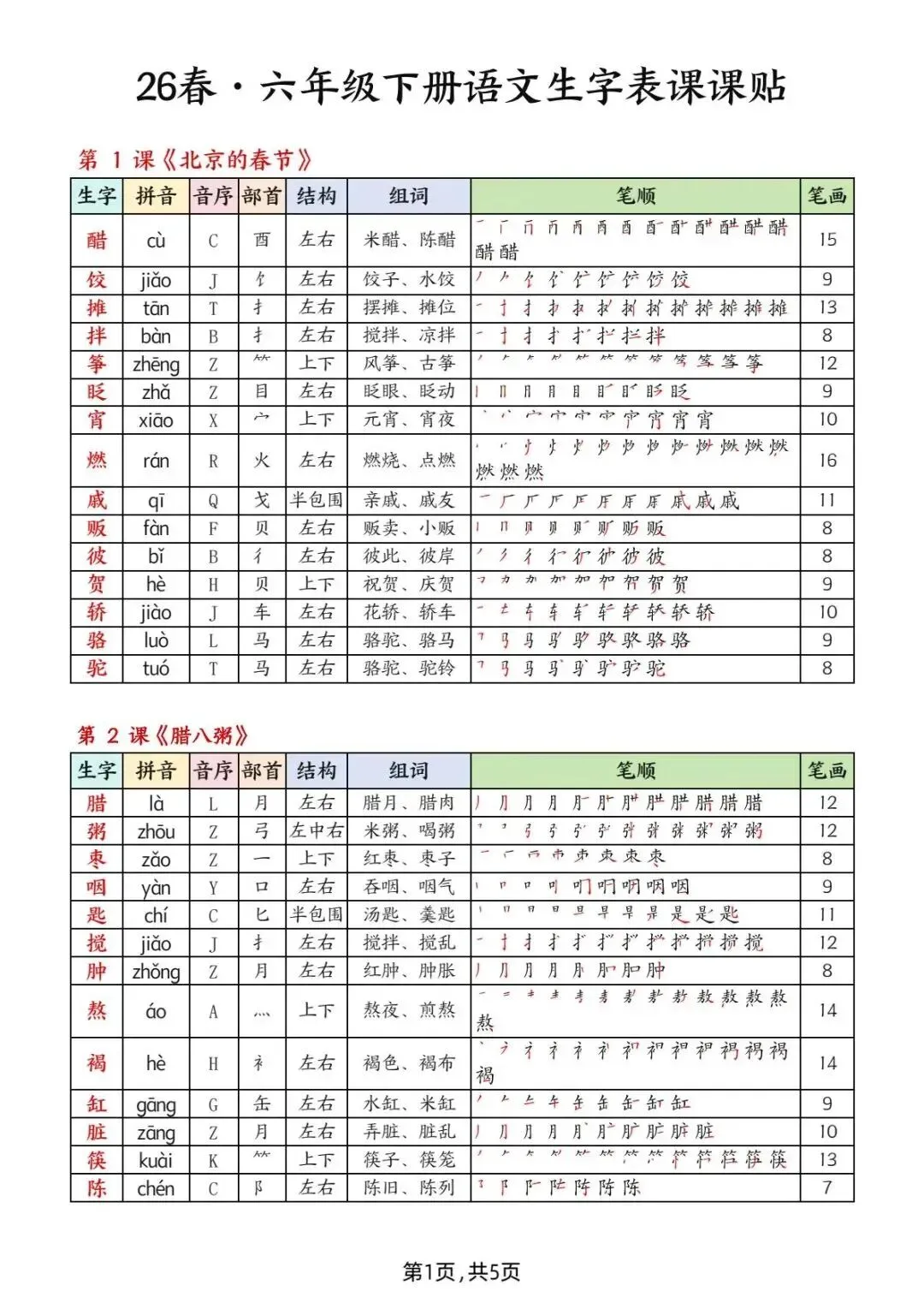 大家好,今天为大家分享2026春六年级下册语文生字表课课贴。这份资料是根据最新教材整理的生字表,每一课的生字都单独成页,清晰明了,非常适合孩子们用来预习和复习。这份高清电子版PDF可以帮助孩子轻松掌握本学期所有生字,打好语文基础。