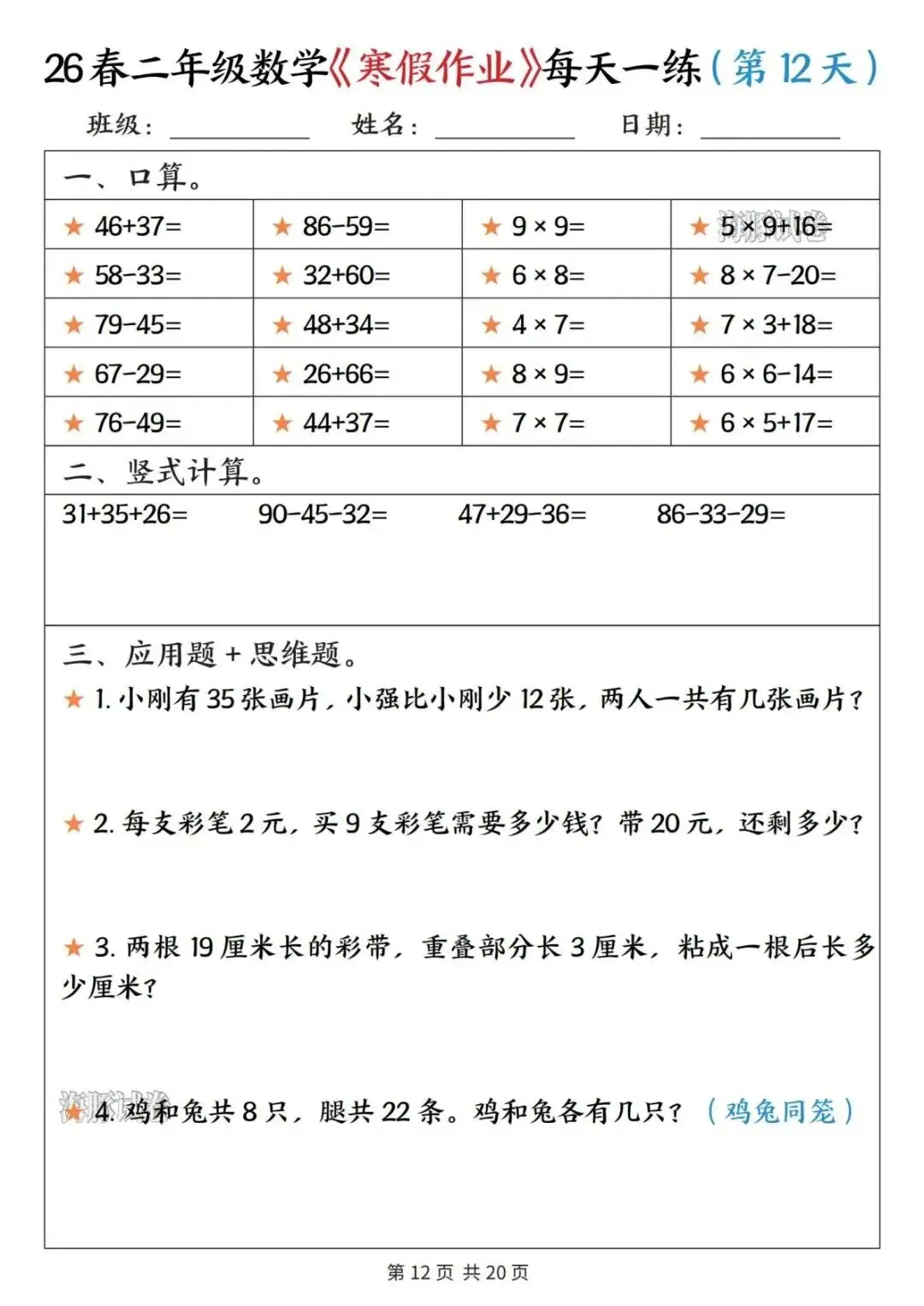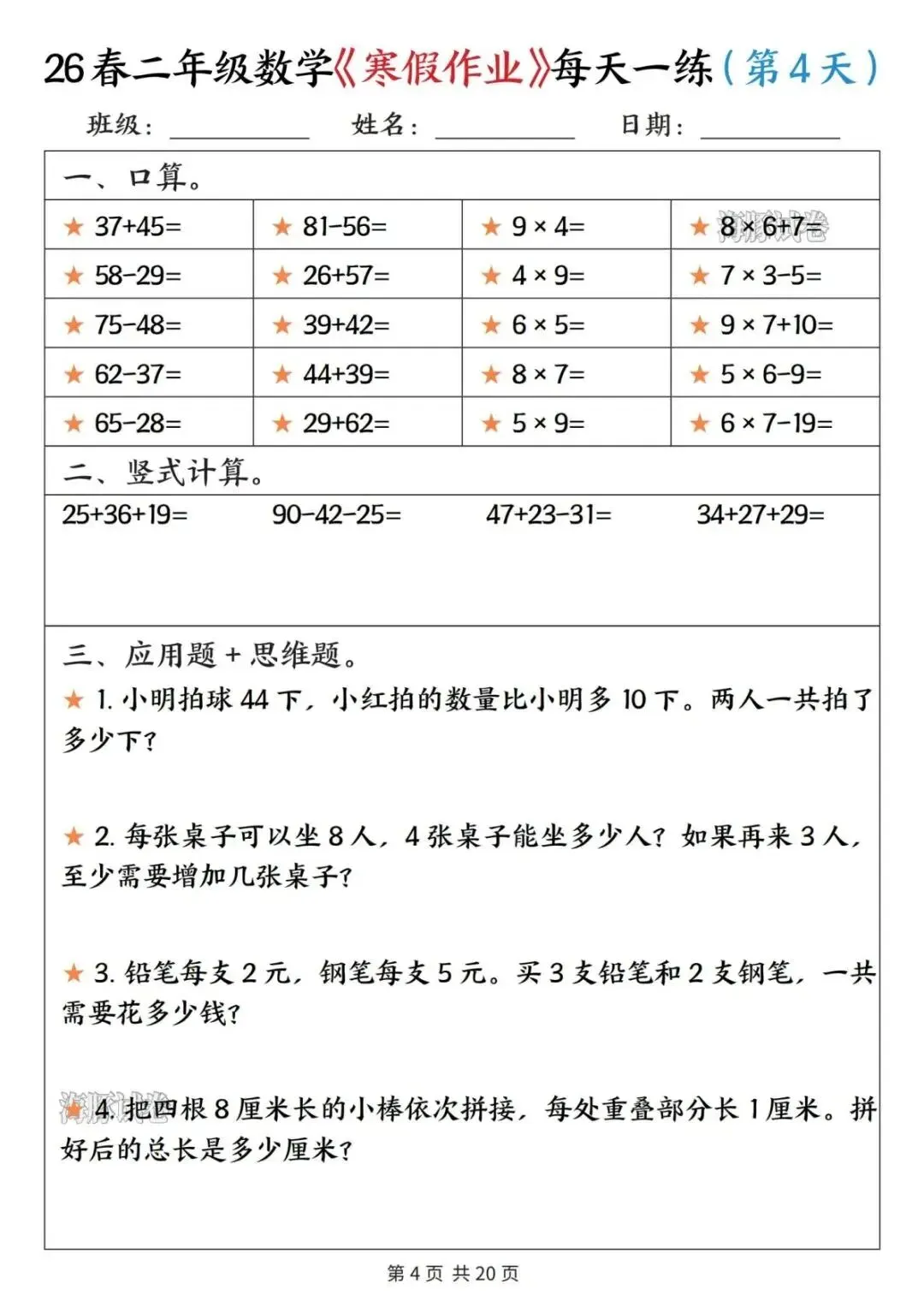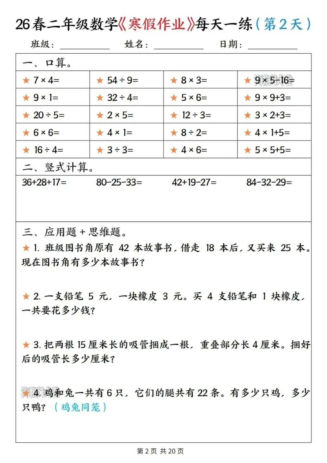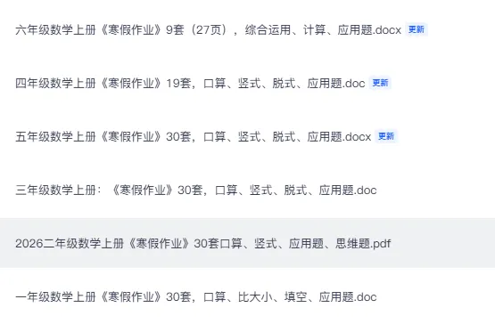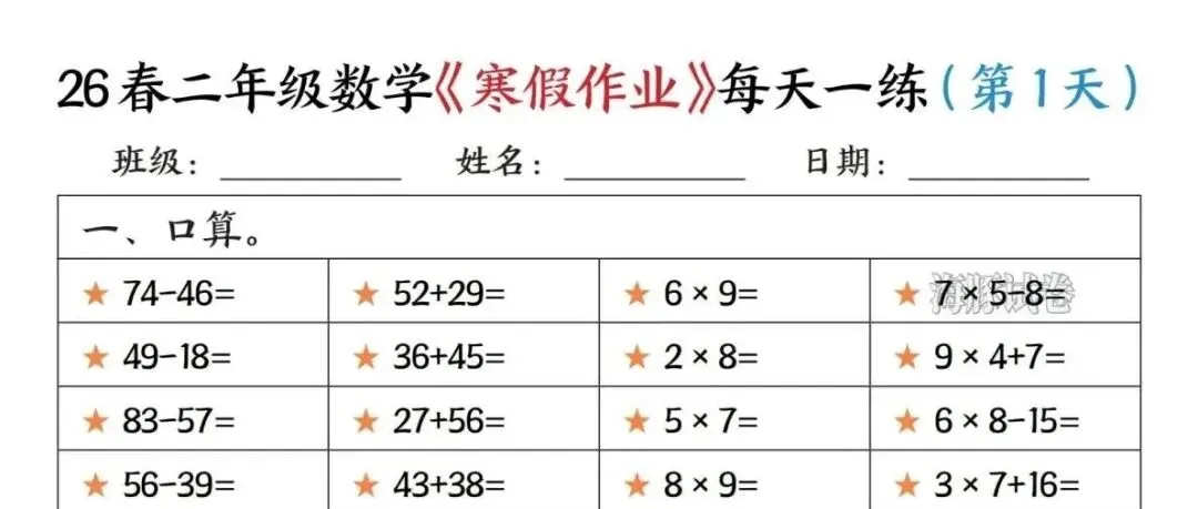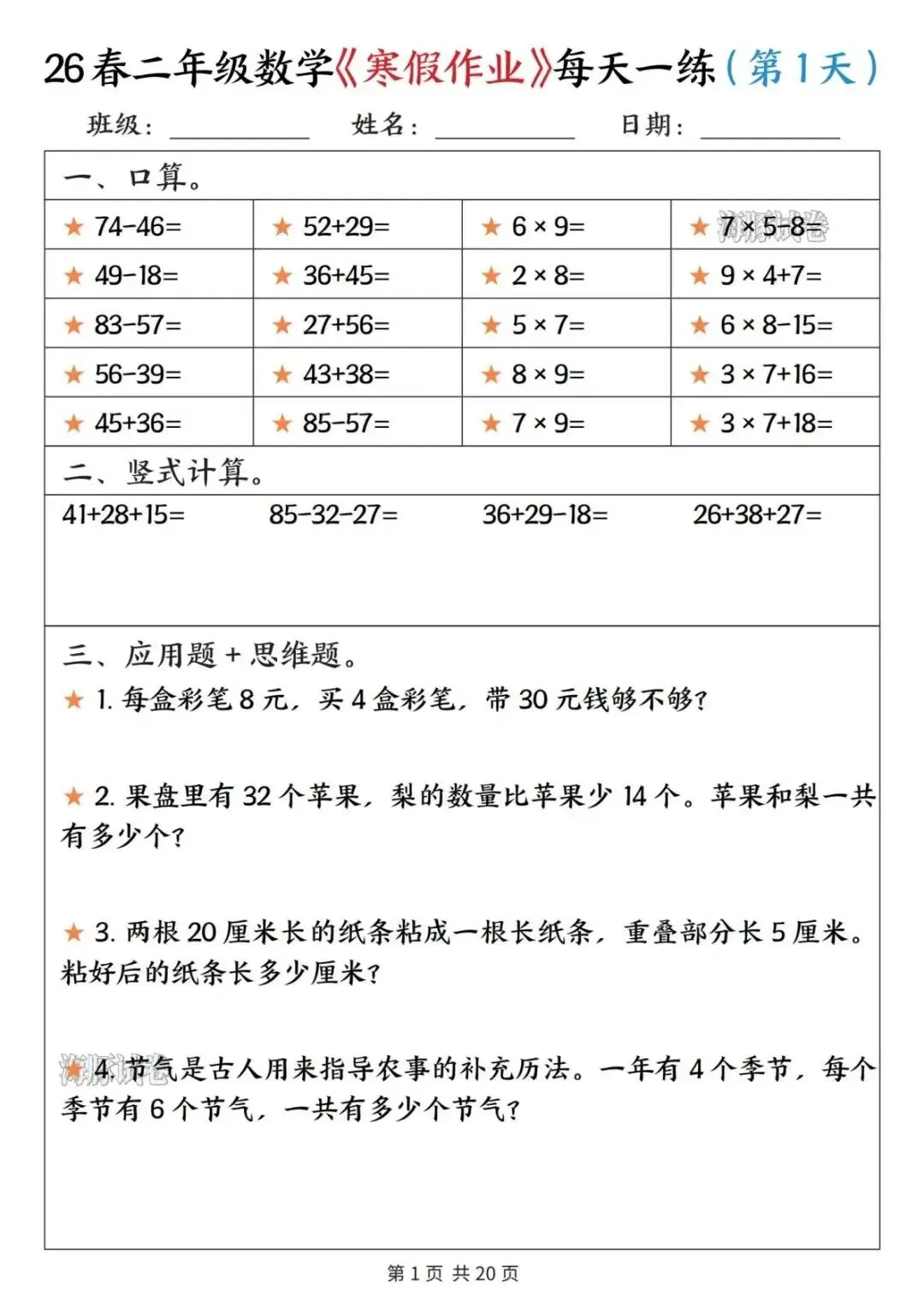 大家好,今天为大家分享一份专为1-6年级学生精心整理的《2026春数学寒假作业》。这份资料涵盖了口算、竖式、脱式计算和应用题四大核心模块,是帮助孩子利用假期巩固数学基础、提升计算能力的绝佳帮手。全套资料均为PDF高清电子版,可直接下载打印,方便孩子练习。