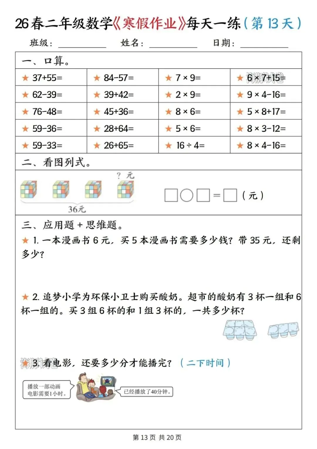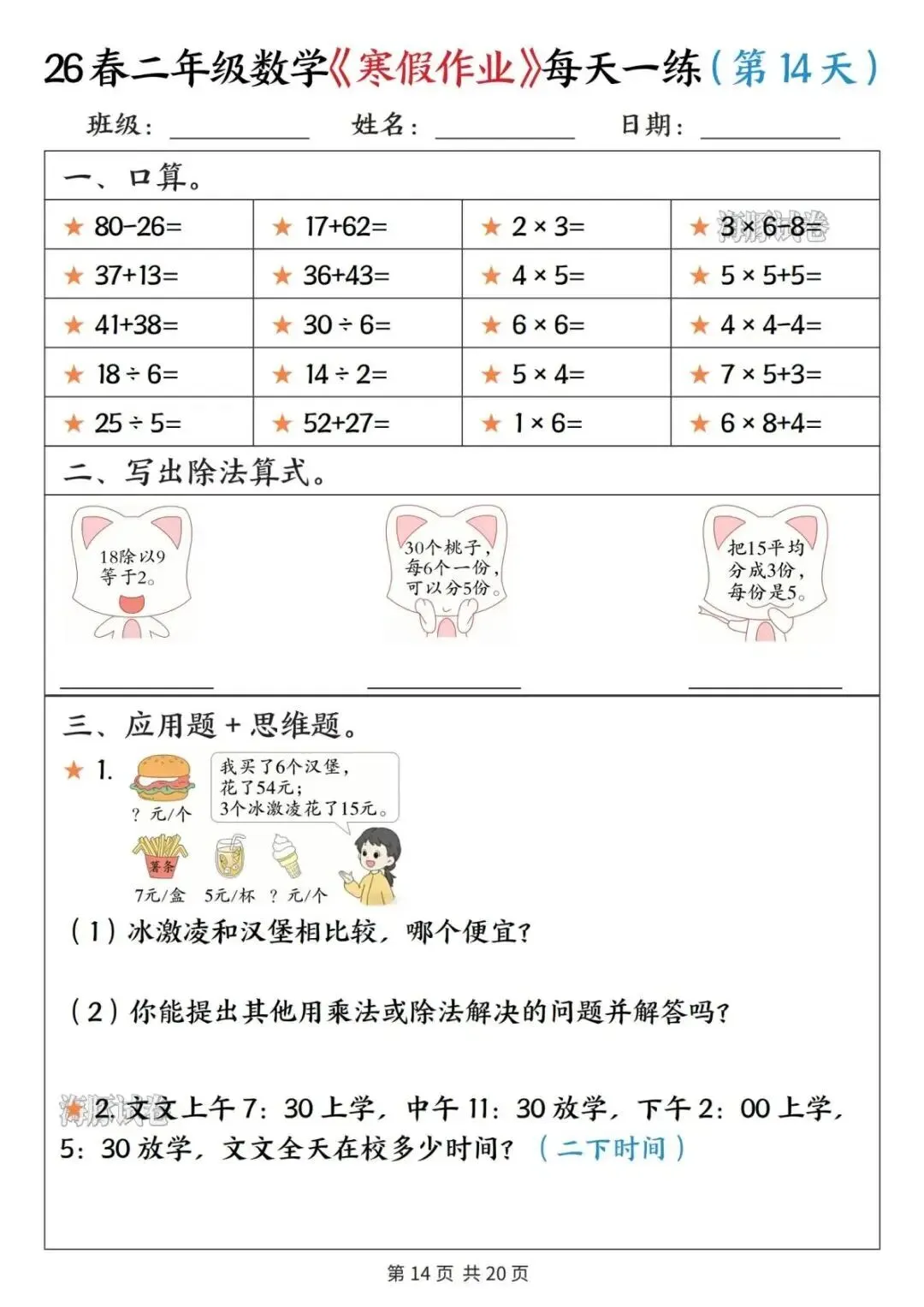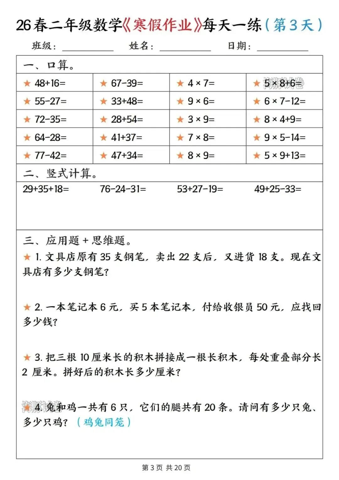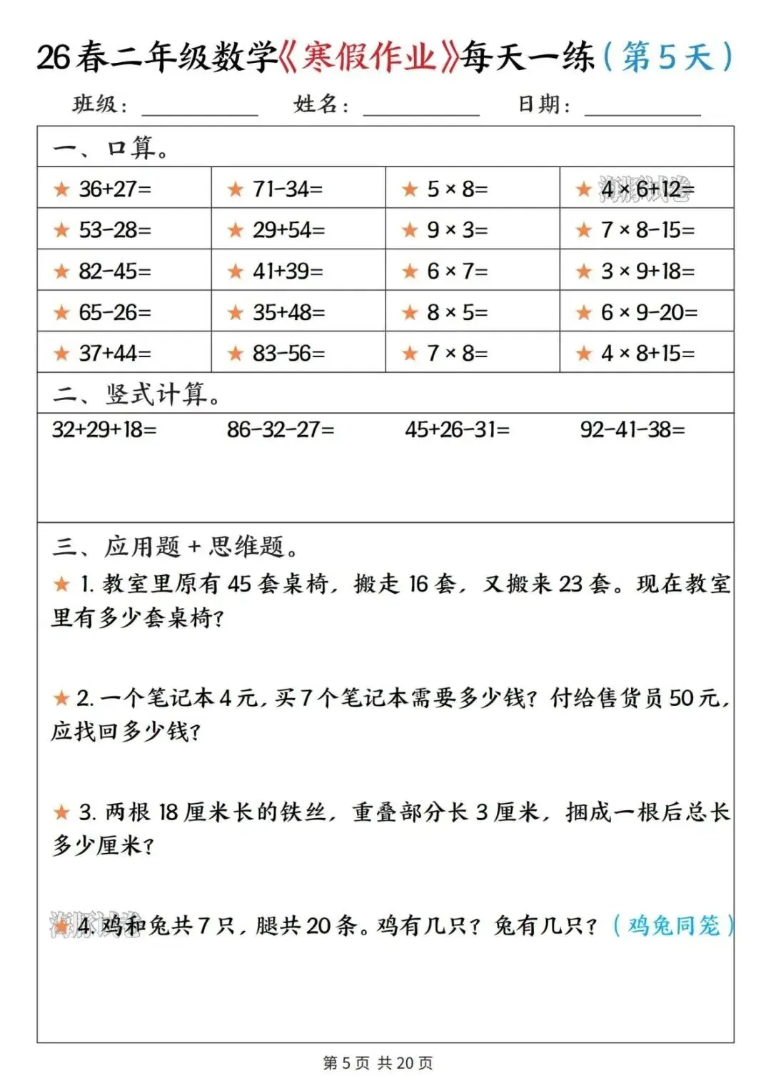 大家好,今天为大家分享一份专为1-6年级学生精心整理的《2026春数学寒假作业》。这份资料涵盖了口算、竖式、脱式计算和应用题四大核心模块,是帮助孩子利用假期巩固数学基础、提升计算能力的绝佳帮手。全套资料均为PDF高清电子版,可直接下载打印,方便孩子练习。