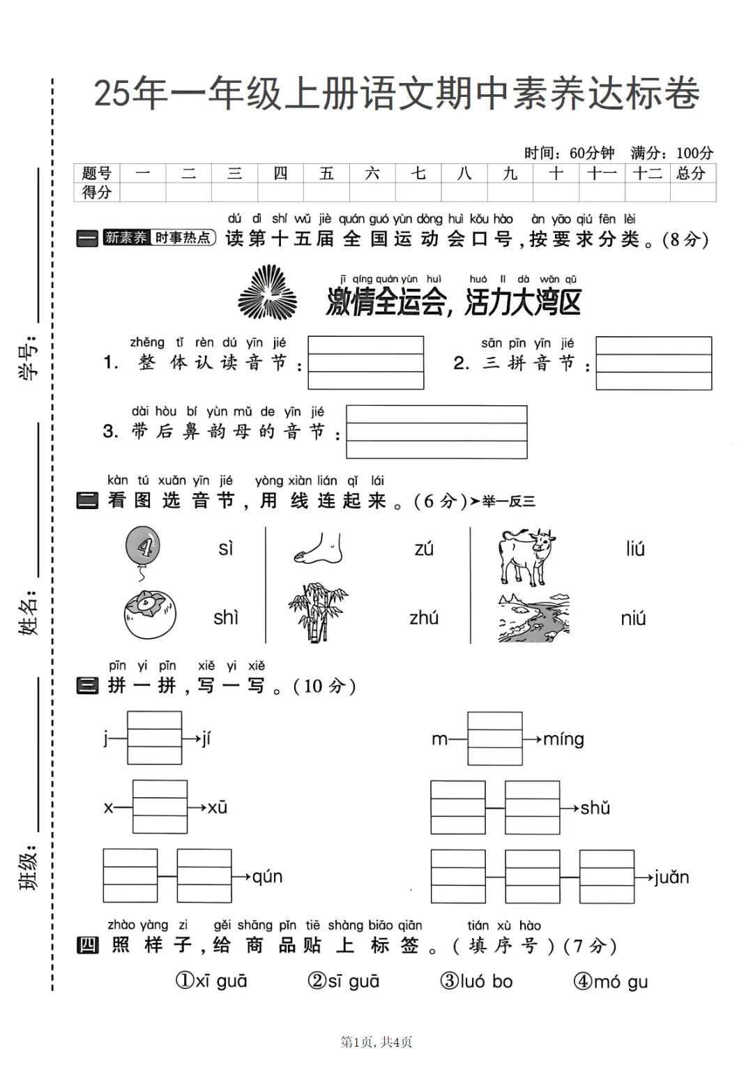 25年一年级上册语文期中素养达标卷(含答案5页)