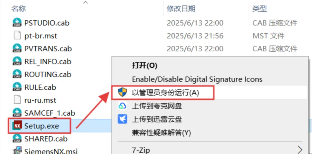 找到【Setup】程序,鼠标右键选择【以管理员身份运行】。