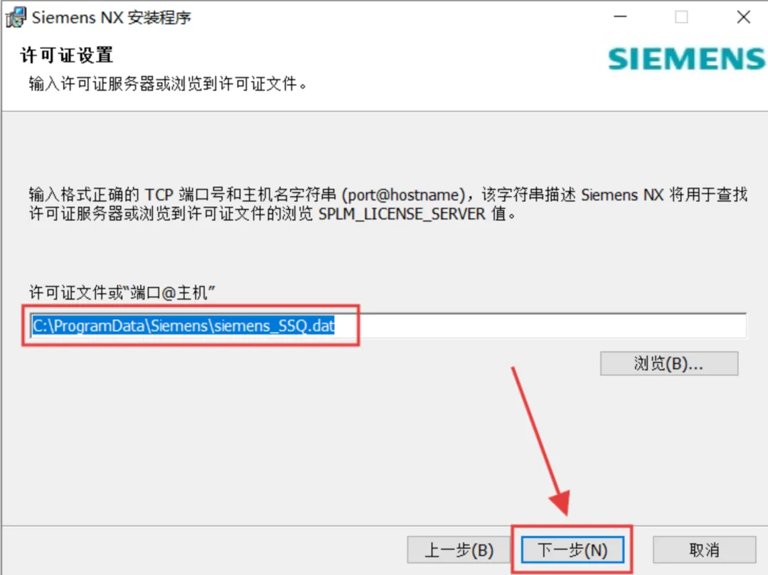 22.输入”端口@主机“【C:\ProgramData\Siemens\siemens_SSQ.dat】,点击【下一步】。