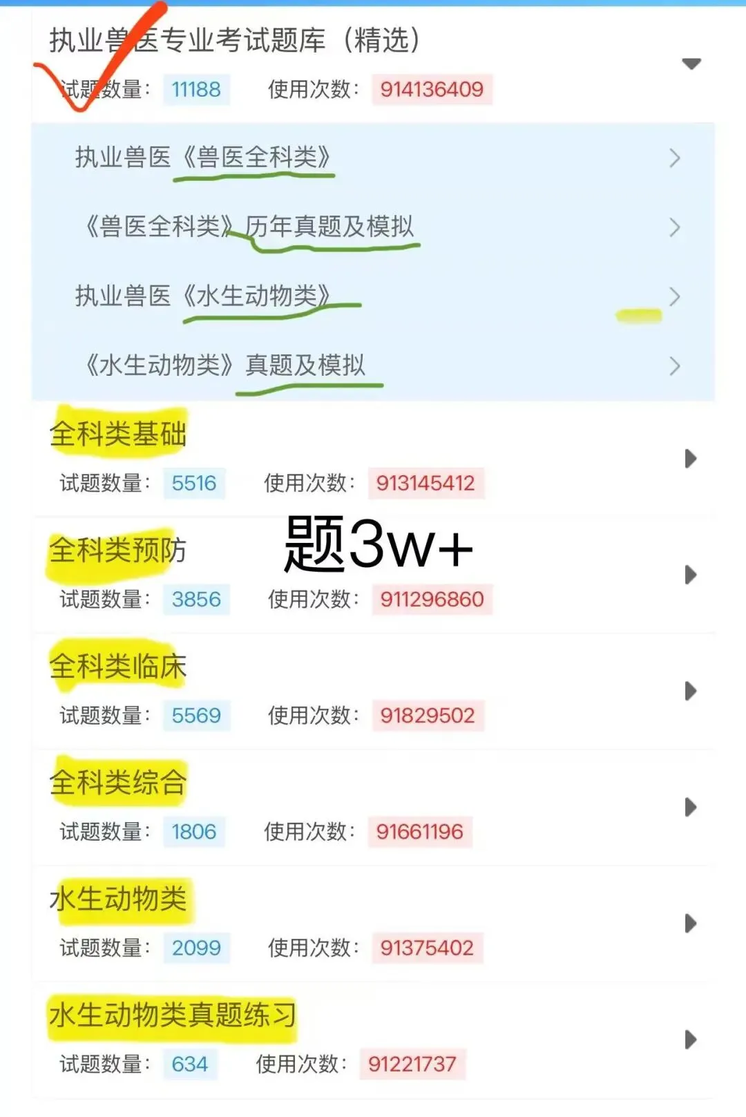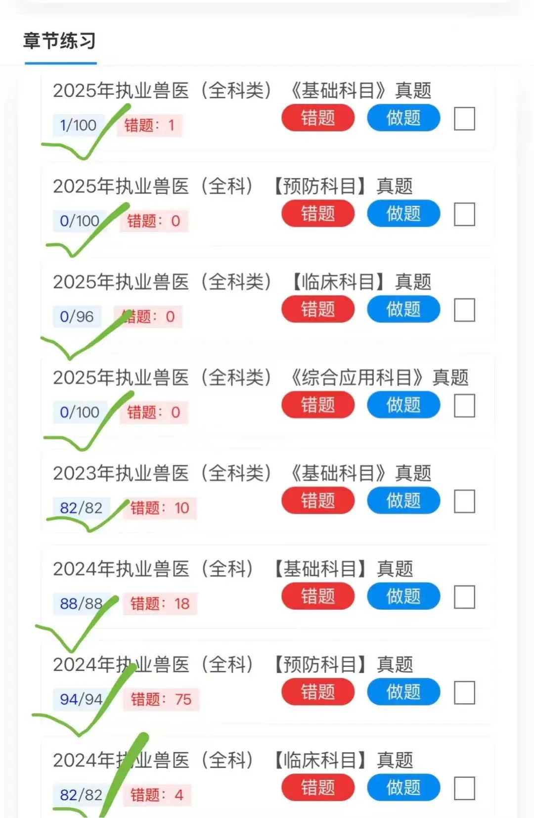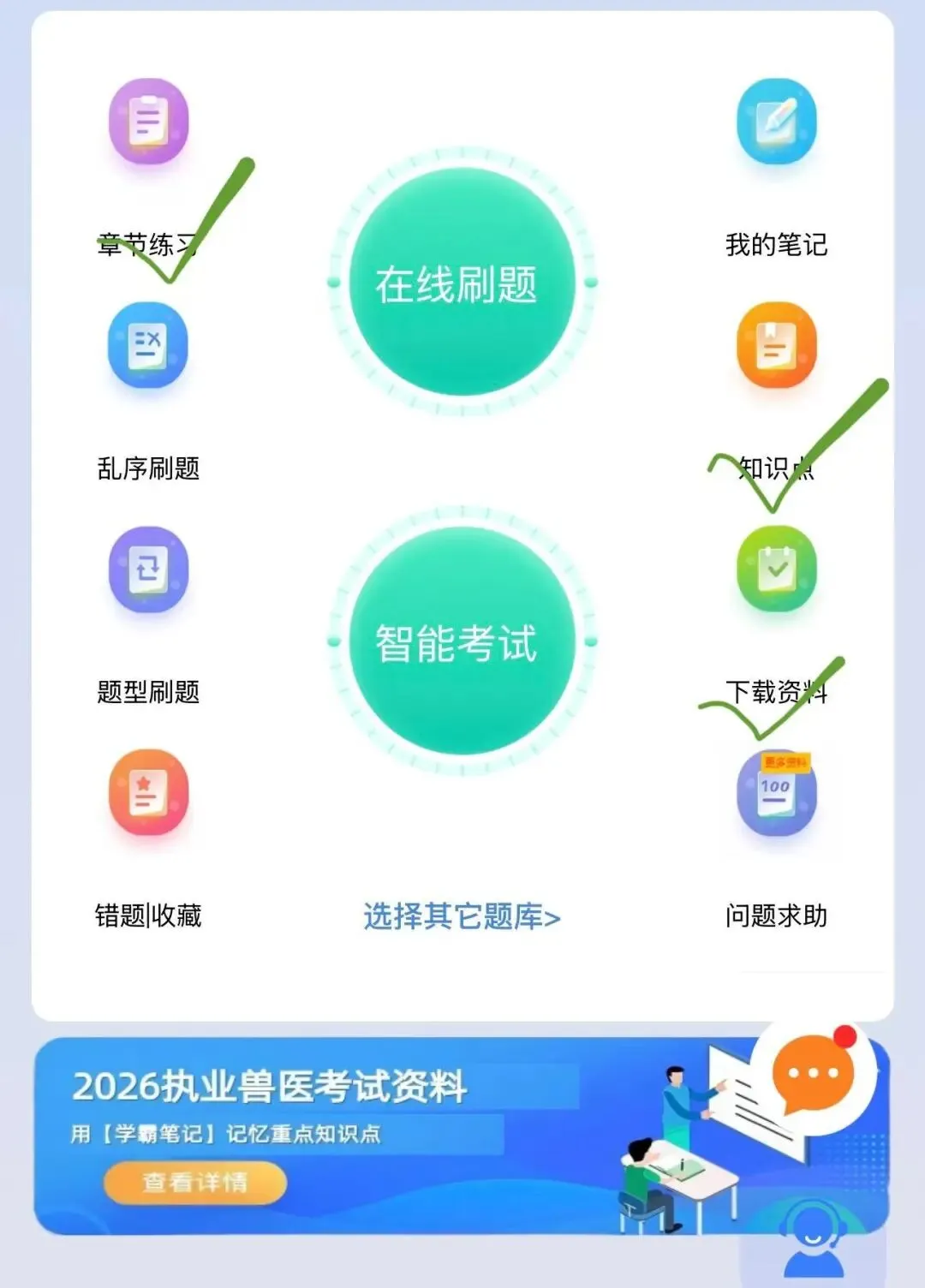 题库涵盖上万道题目,内容灵活丰富,不仅提供分科目、分章节的真题和模拟练习题,还收录了大量历年执业兽医考试的真题。错题会自动归纳,未做题目也有清晰标识,每道题都配有通俗易懂的解析,方便理解记忆。题目与教材章节对应,适合在听完网课或看完教材后及时练习,有助于巩固记忆、深化理解,实现知识点的融会贯通。