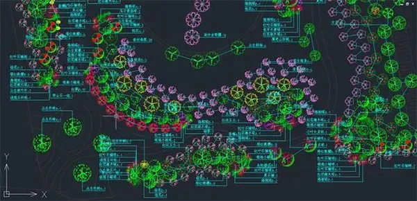 为了满足不同公司的绘图需求,中望景园提供了多种配置的苗木图块标注格式与标注类型,苗木图块支持折线标注、弧线标注、框选灌木自动标注、增加灌木标注、长度标注以及名称标注、不带连线标注等。为减轻设计师繁琐的标注工作提供强有力的支持。