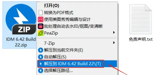 1.打开下载好的文件夹,找到压缩包,鼠标右键选择【解压到IDM 6.42 Build 22\】。