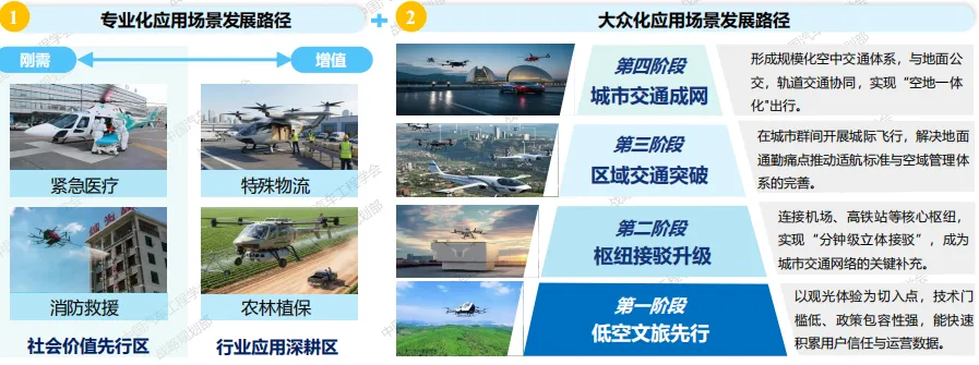 报告指出,飞行汽车应用场景遵循“专业化与大众化双线并行推进”的核心逻辑,最终融入城市综合交通体系。报告明确了“专业化与大众化双线并行推进”的布局逻辑: