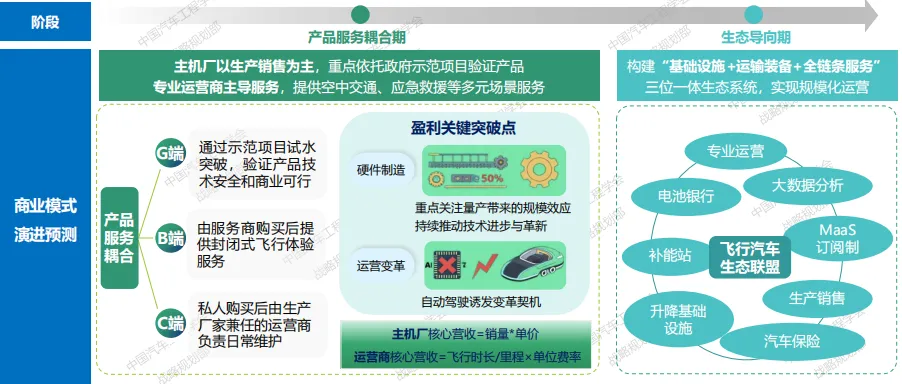报告认为,飞行汽车商业模式将沿“耦合产品服务→闭环生态”两阶段演化,最终通过共享运营和平台化服务,构建可持续的立体出行价值网络。