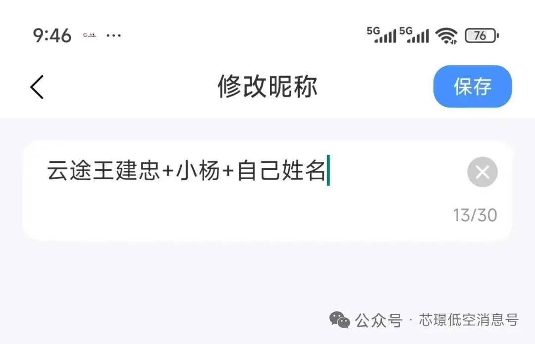 三、改自己昵称,就跟改微信昵称一样,“云途王建忠+推荐人姓名+自己姓名”比如“张三”让我注册了,我叫“王美丽”,就改成:“云途王建忠+张三+王美丽”改好昵称后再加王建忠,不然王建忠好友太多,不知道你是谁,他就不想通过了。