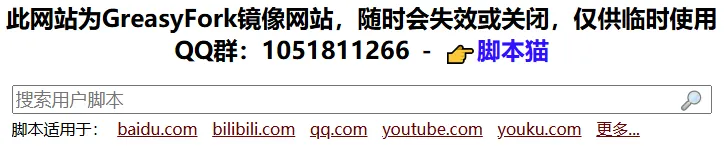 greasyfork.org暂时可以访问对应镜像网站,随时会失效或关闭,且用且珍惜,如果失效了,可以通过QQ群或者其他搜索引擎寻找最新镜像网站。