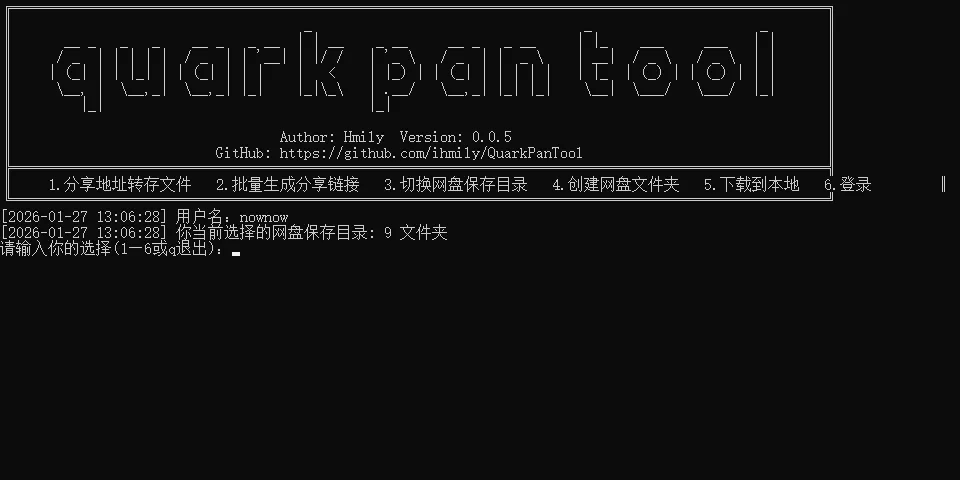 https://github.com/ihmily/QuarkPanTool软件界面为批处理DOS窗口,功能截图示意: