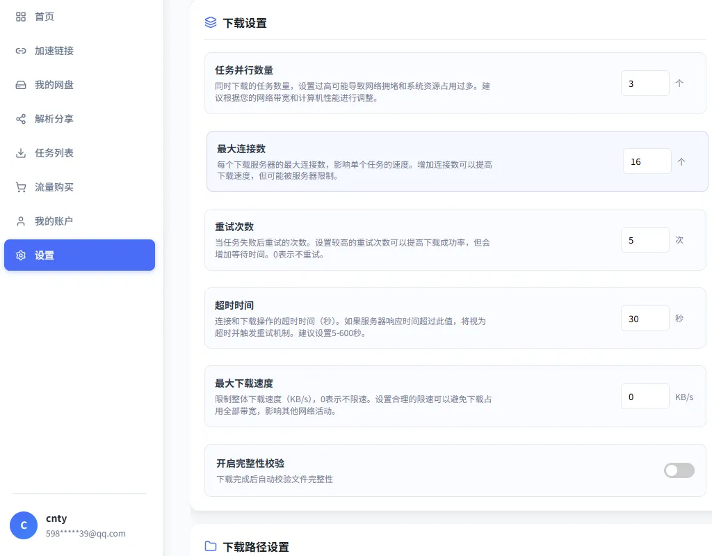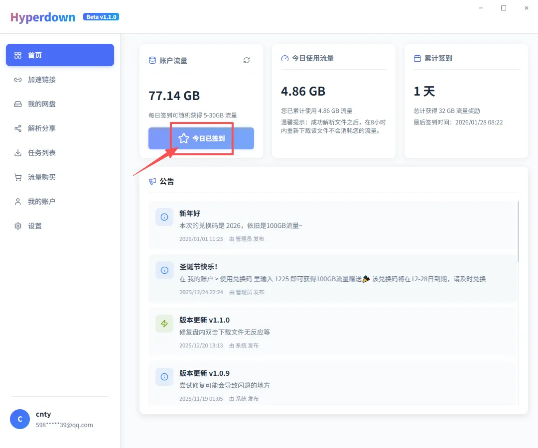 安装用QQ邮箱注册一个账号,即送50G下载流量,每天签到可以随机领不同多小的流量,个人感觉已够用了。