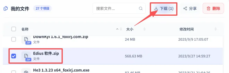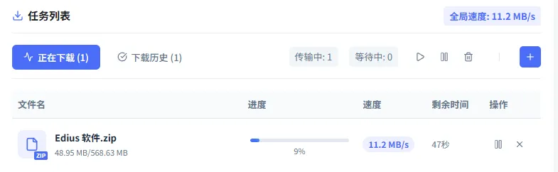 进入自己的网盘,选中需要下载的文件(如果是他人分享的可以先转存再下载),比如这个EDius文件,直接点击上面的下载即可自动添加到任务列表并开始下载,下载速度每秒11M(不同网络速度不同,我这儿网速较慢)。