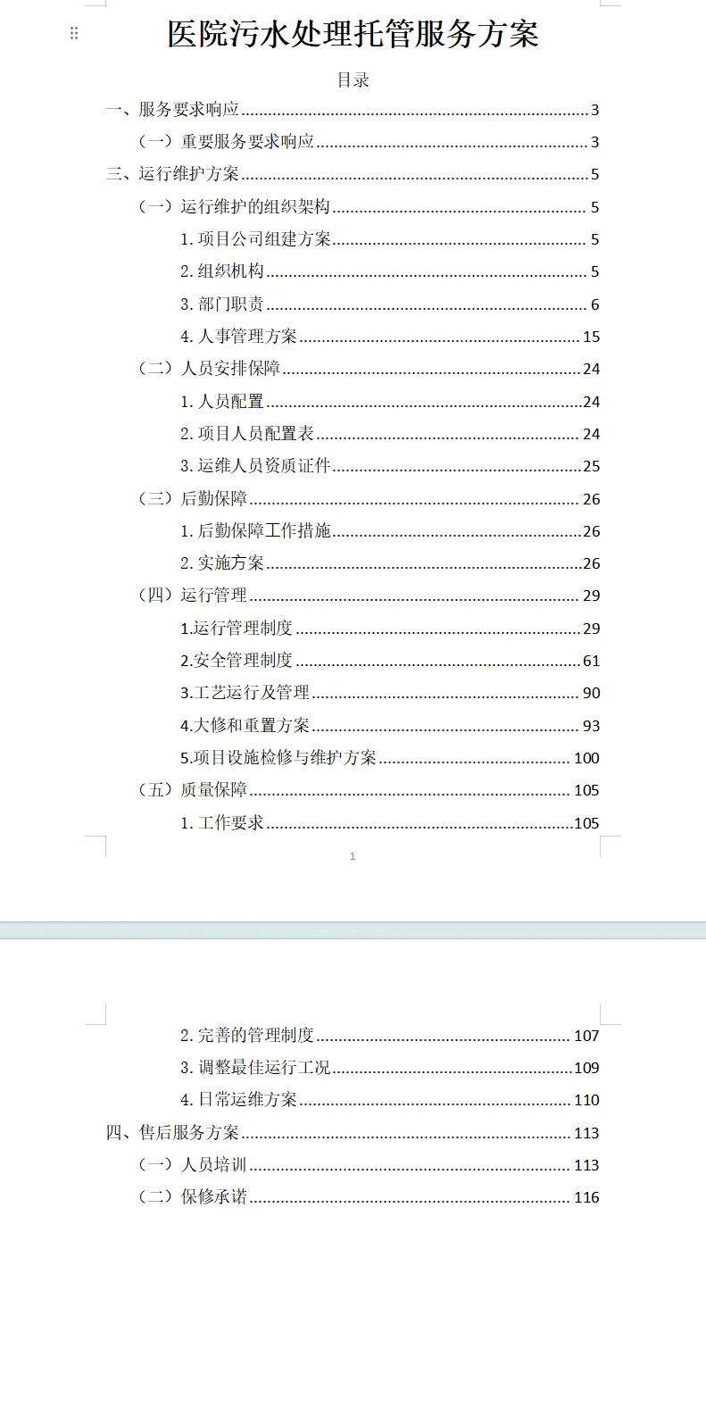 医院污水处理托管服务方案 这份医院污水处理托管服务标书逻辑严密、排版规范、针对性极强,是一份贴合医疗场景需求、落地性强的高质量专业标书,核心优势集中在 “合规响应、全流程管控、风险防控” 三大维度。 一、逻辑层面:精准闭环,贴合医疗场景核心需求 结构闭环:遵循 “需求响应→落地执行→售后保障” 逻辑,从服务要求响应(紧扣医院污水消毒、合规监测等核心),到运行维护方案(组织、人员、制度、工艺、质量全覆盖),再到售后服务(培训、保修),形成完整服务链条。 重点突出:聚焦医疗污水特殊性,强化 “传染病医院排放标准”“三甲评审配合”“应急处置” 等核心需求,所有方案围绕 “达标排放、合规备案、风险可控” 展开,无冗余内容。 权责清晰:组织架构、部门职责、岗位分工层层明确,从站长到一线运维人员的权责边界清晰,确保每个环节有人负责、有制度可依。 二、排版布局:规范清晰,易读易查 层级分明:采用 “总目录→章节标题→小标题→列表 / 表格” 结构,一级至三级标题区分明确,关键内容(如人员配置、制度条款、工艺步骤)用列表或表格呈现,避免大段文字堆砌。 重点可视化:核心数据(如维保频次、人员配置数量)、关键流程(如大修程序、应急处置步骤)用表格提炼,合规要求(如排放标准、资质要求)直接呼应招标文件,方便评审快速抓取核心信息。 衔接顺畅:各章节逻辑衔接紧密,如 “组织架构” 对应 “人员配置”,“安全管理制度” 衔接 “应急处置方案”,前后内容无冲突、无断层。 三、值得学习的核心亮点 精准响应招标文件:逐条对应招标要求(如格栅清掏频次、消毒标准、在线监测数据上报),明确承诺响应内容,无模糊表述,合规性突出。 制度体系全覆盖:运行、安全、质量、人事、应急等管理制度齐全,且贴合医疗污水场景(如危险化学品管理、职业中毒防控、医疗废物协同处置),可直接落地。 人员与培训保障具体:明确最低人员配置、资质要求,制定分层级培训计划(领导层、管理层、操作层),兼顾 “持证上岗” 与 “持续能力提升”,确保服务稳定性。 风险防控到位:单独强化安全管理(高空 / 井下作业、电气设备、化学品安全)和应急处置(突发事故、水质异常),贴合医疗场景风险点,防控措施具体可操作。 质量管控全流程:从日常运维(每日 / 每月 / 每年工作清单)到工艺管控(预处理、生化处理、污泥处置),再到第三方监测配合,形成 “过程管控 + 结果验证” 的质量闭环。 |